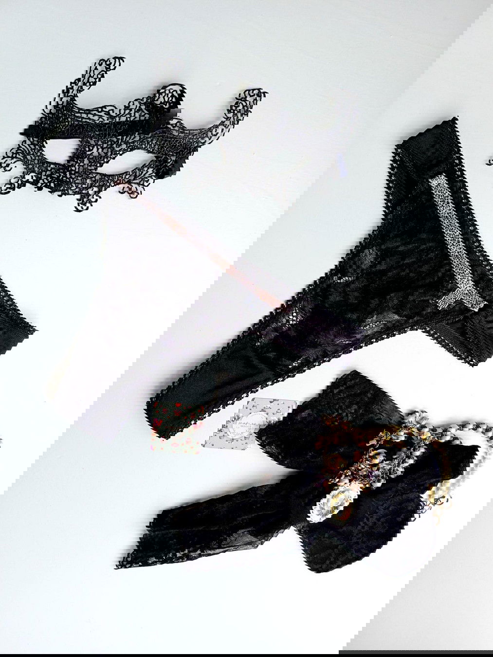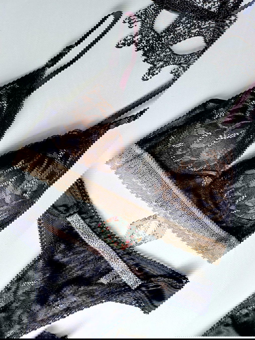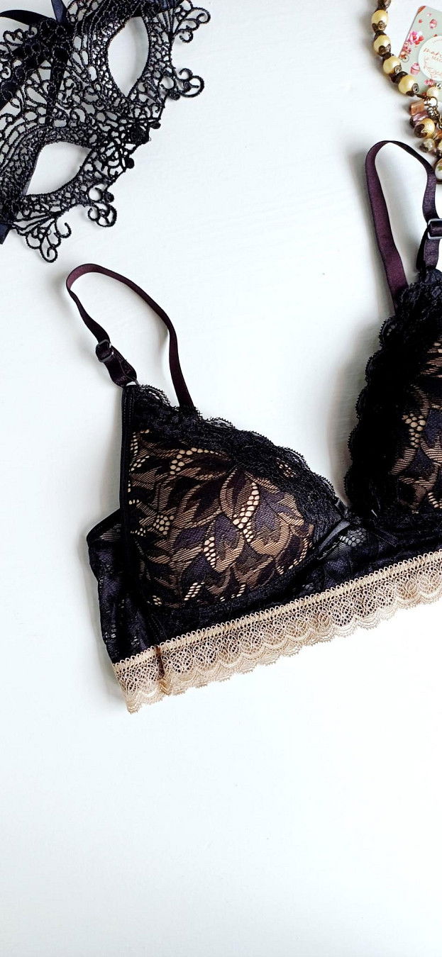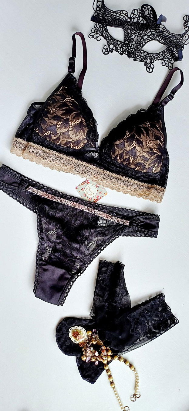 conjunto de corpiño taza soft triangulo y bombacha cola less en puntilla negra