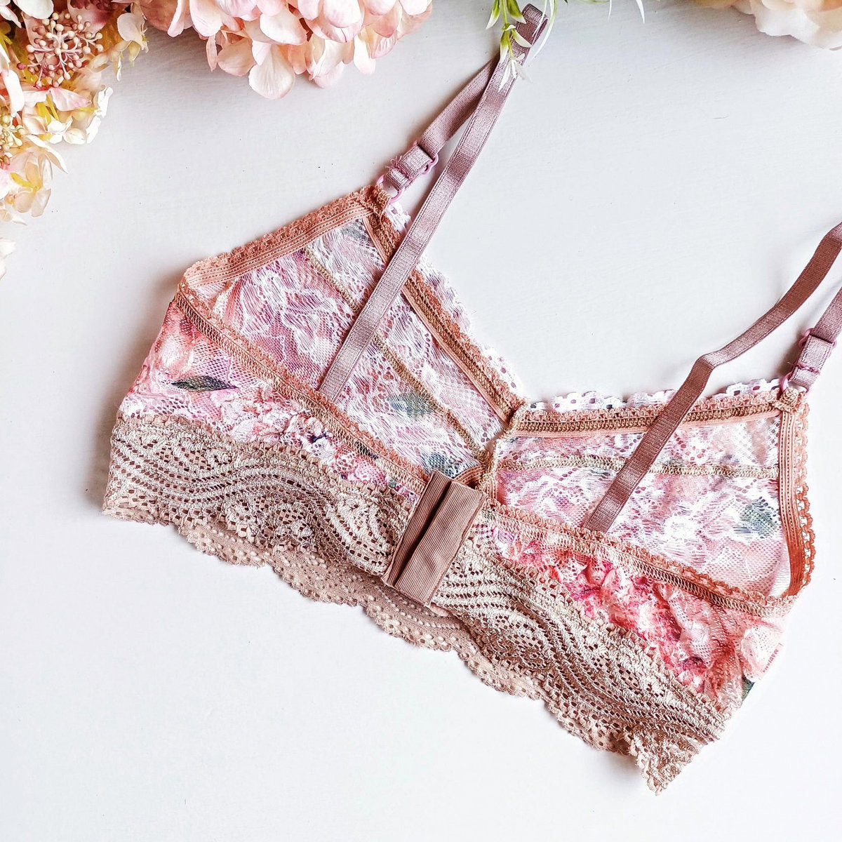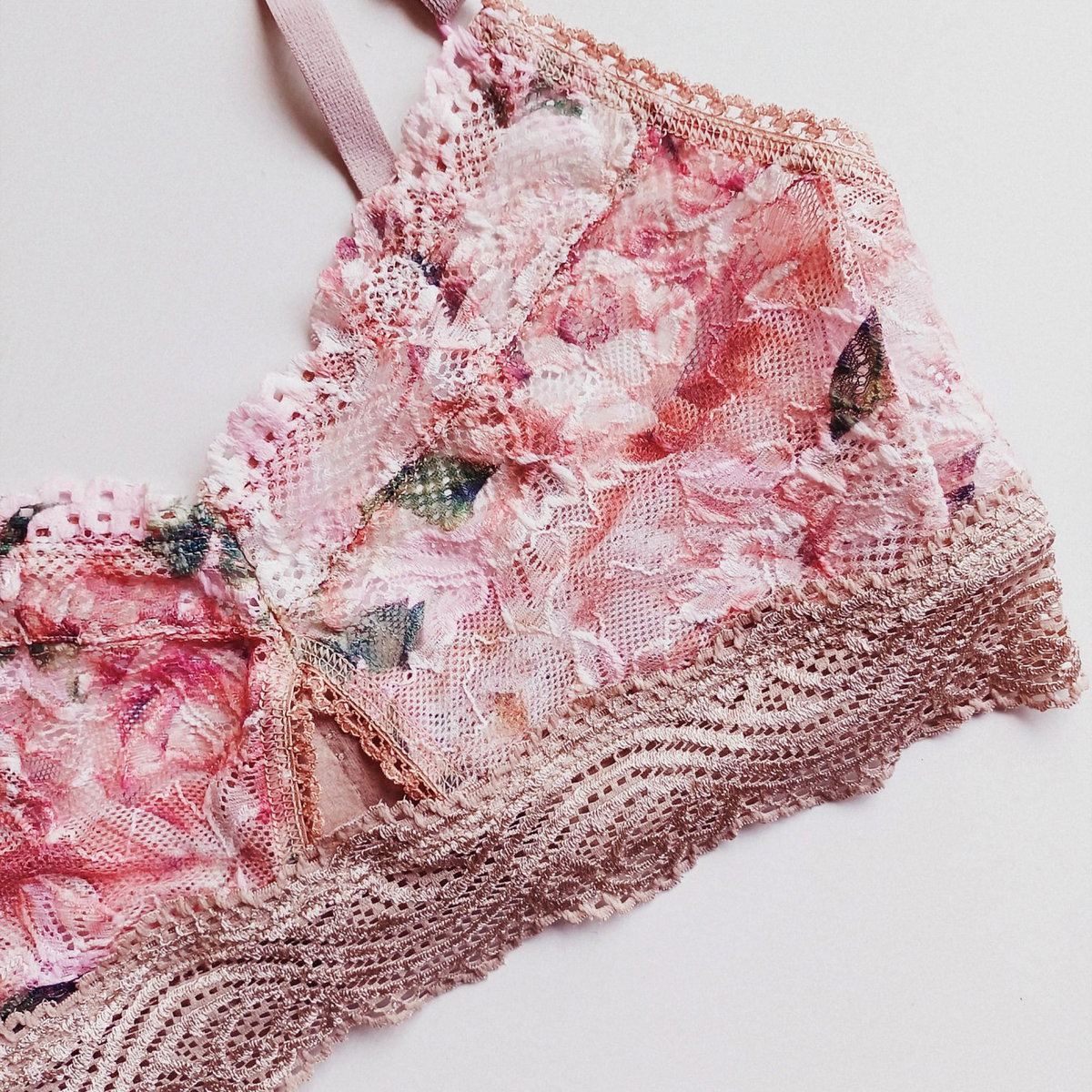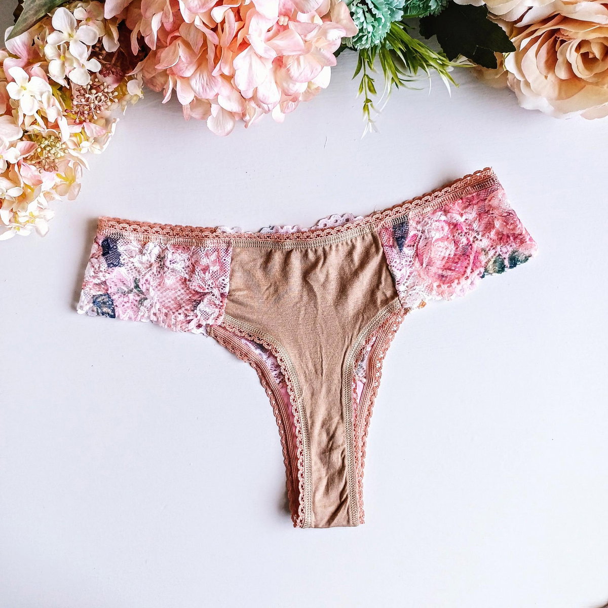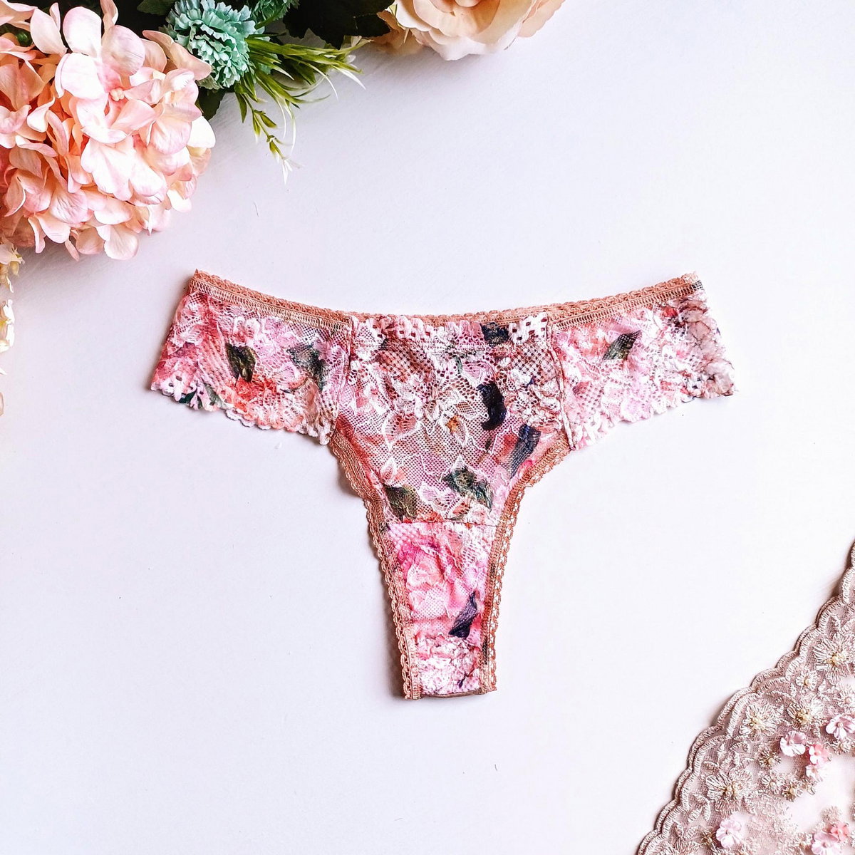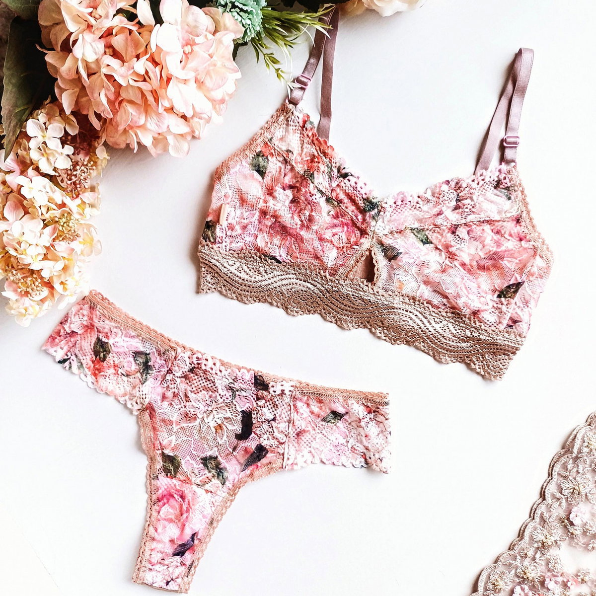 conjunto de corpiño tipo top con abertura y bombacha cola less en puntilla estampada flores rosadas