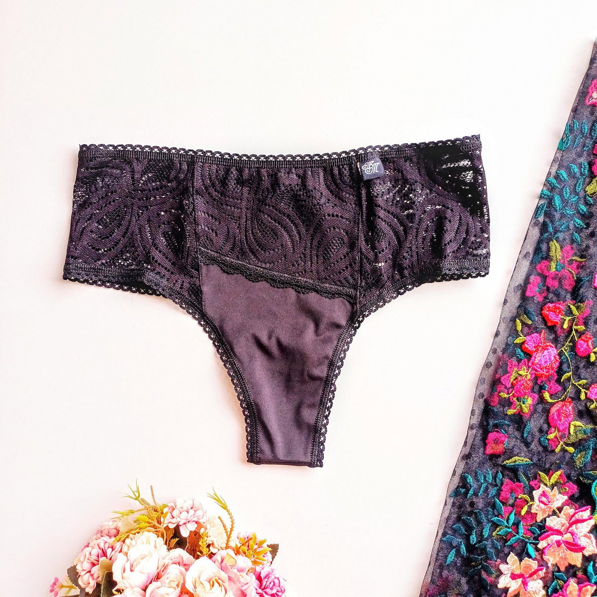 Culottes de tiro alto en lycra negra con puntilla a juego.