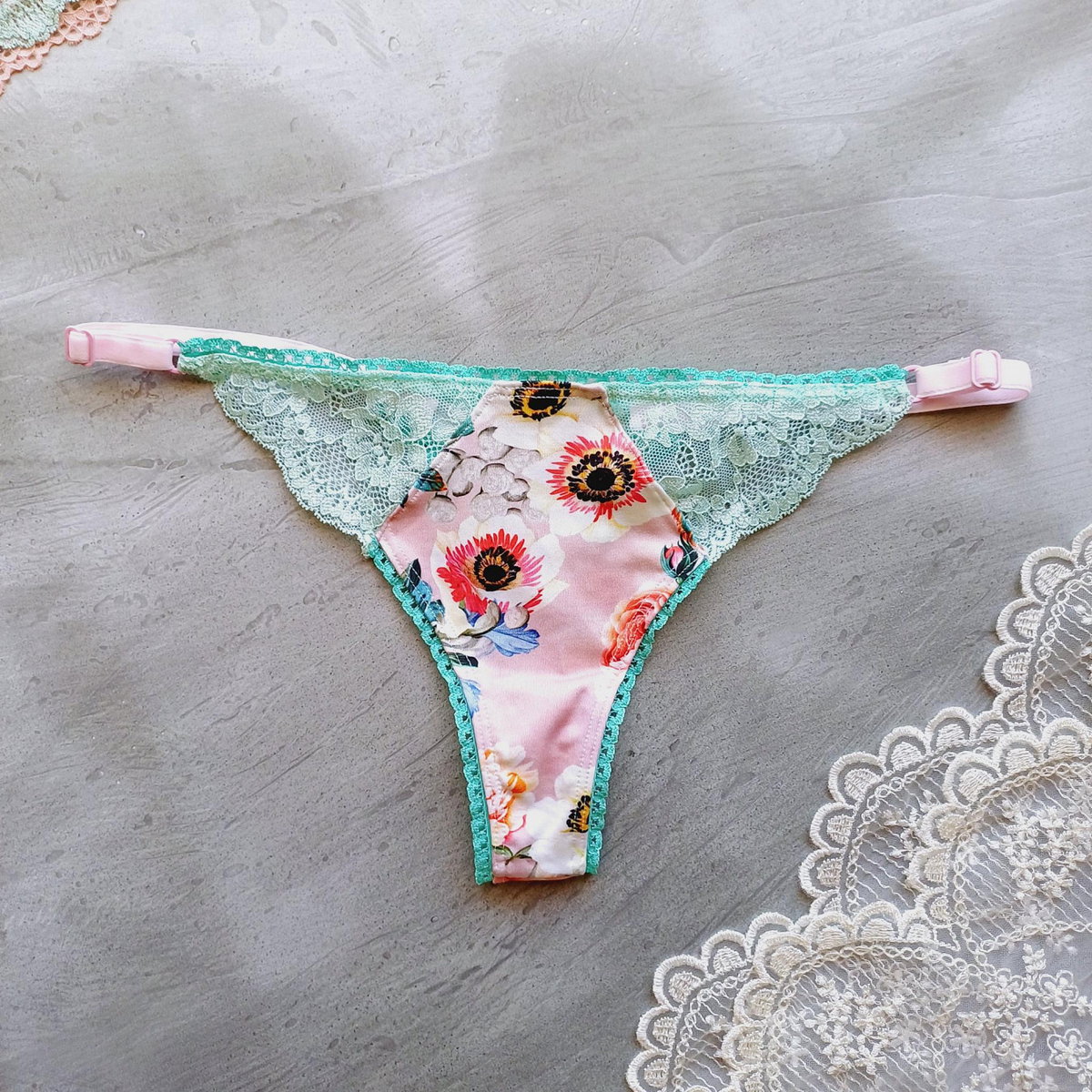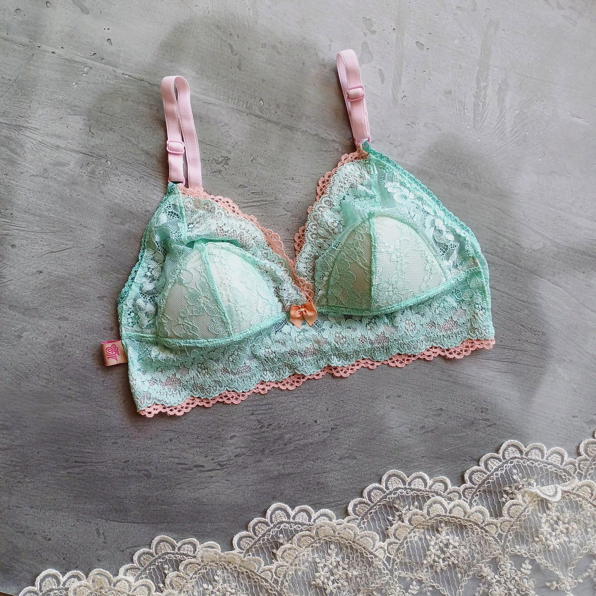 conjunto de corpiño con detalle en bondeado y tanga cola less en puntilla verde aqua