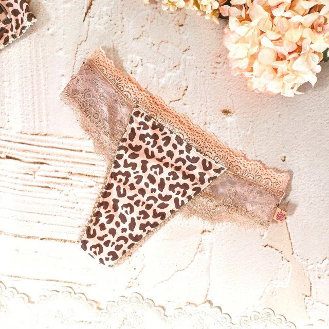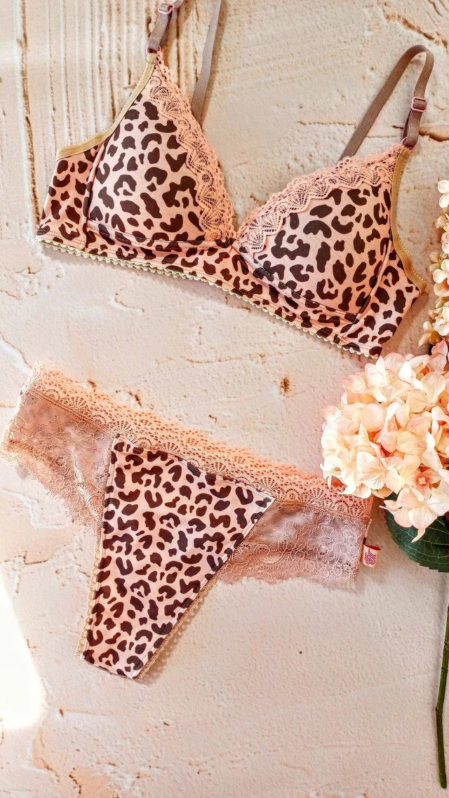Conjunto de corpiño triángulo taza soft y bombacha cola less haciendo juego, confeccionado en modal estampado de leopardo rosa con detalles en puntilla a tono.