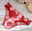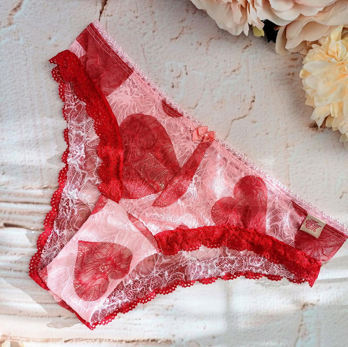 Vedetina confeccionada en encaje estampado de corazones rojos sobre fondo rosa, con detalles de puntilla roja en la pierna.