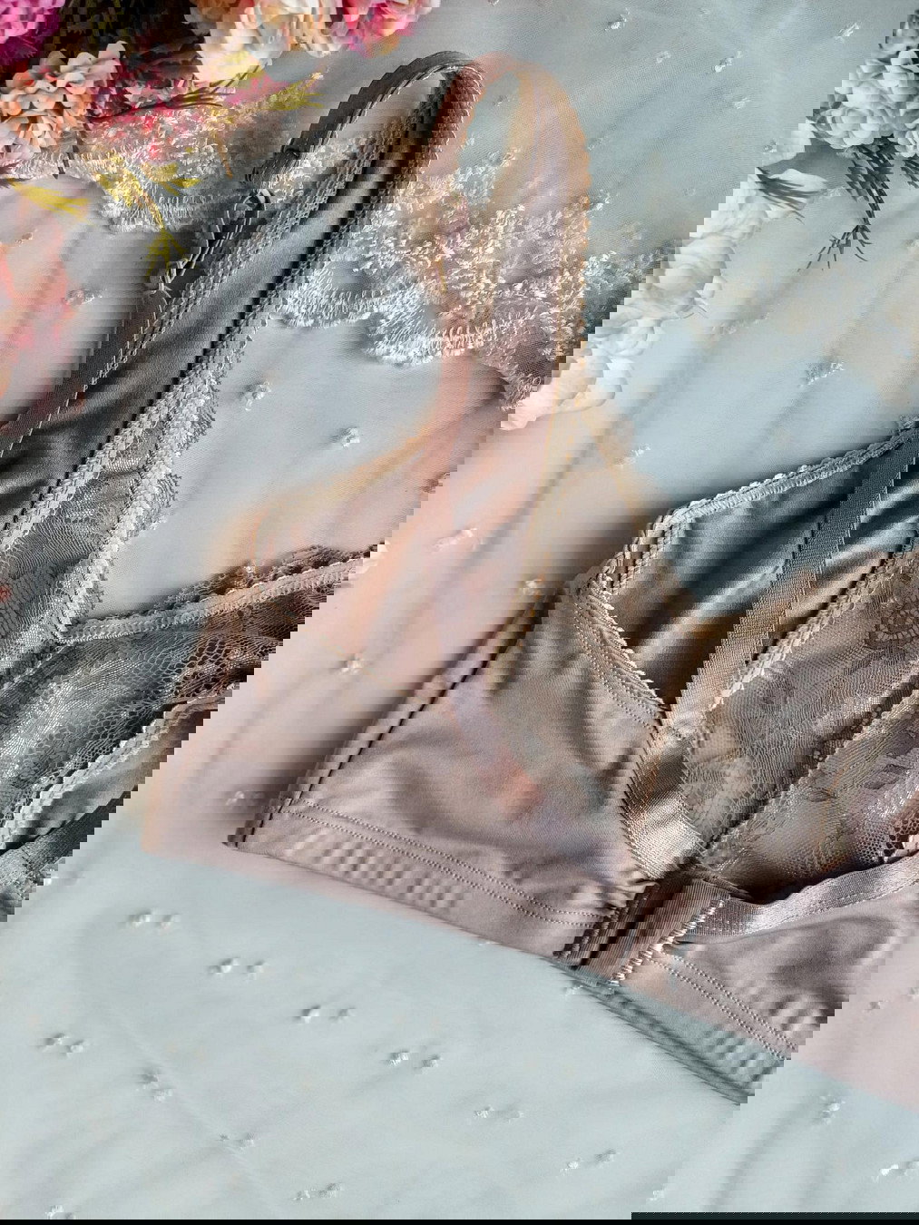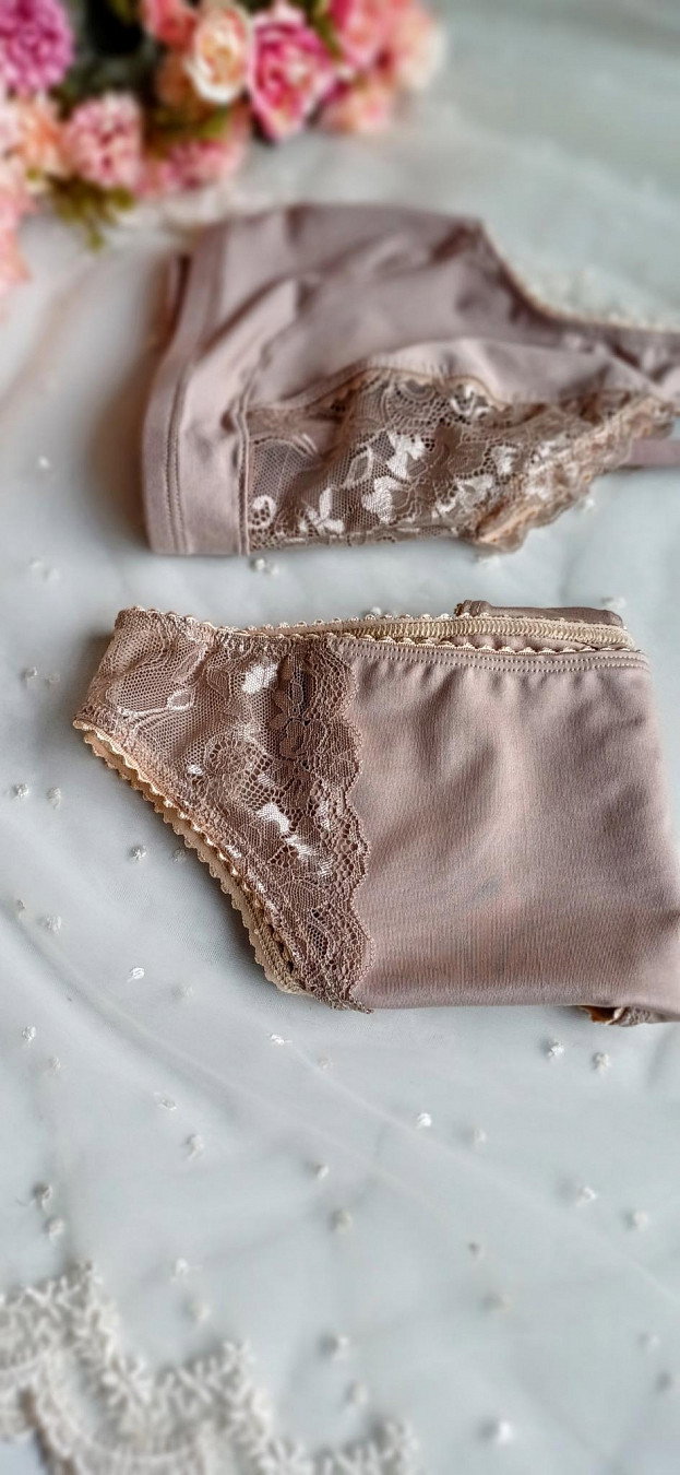 Conjunto de corpiño tipo reductor y vedetina tiro alto confeccionado en lycra color piedra.