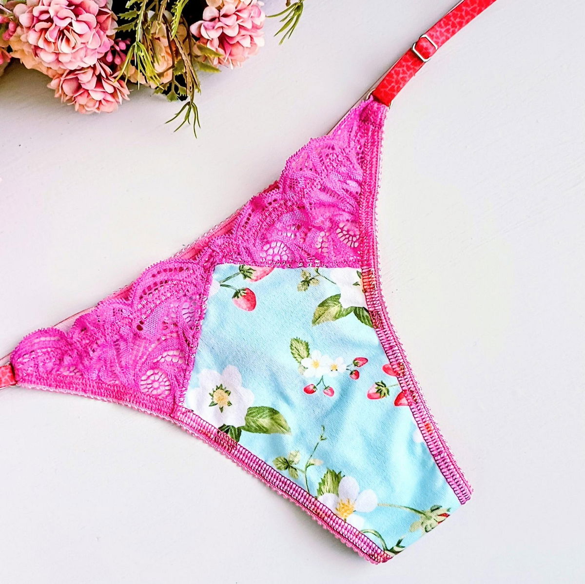 Tanga cola less confeccionada en modal estampado de guindas con detalles en puntilla cereza.