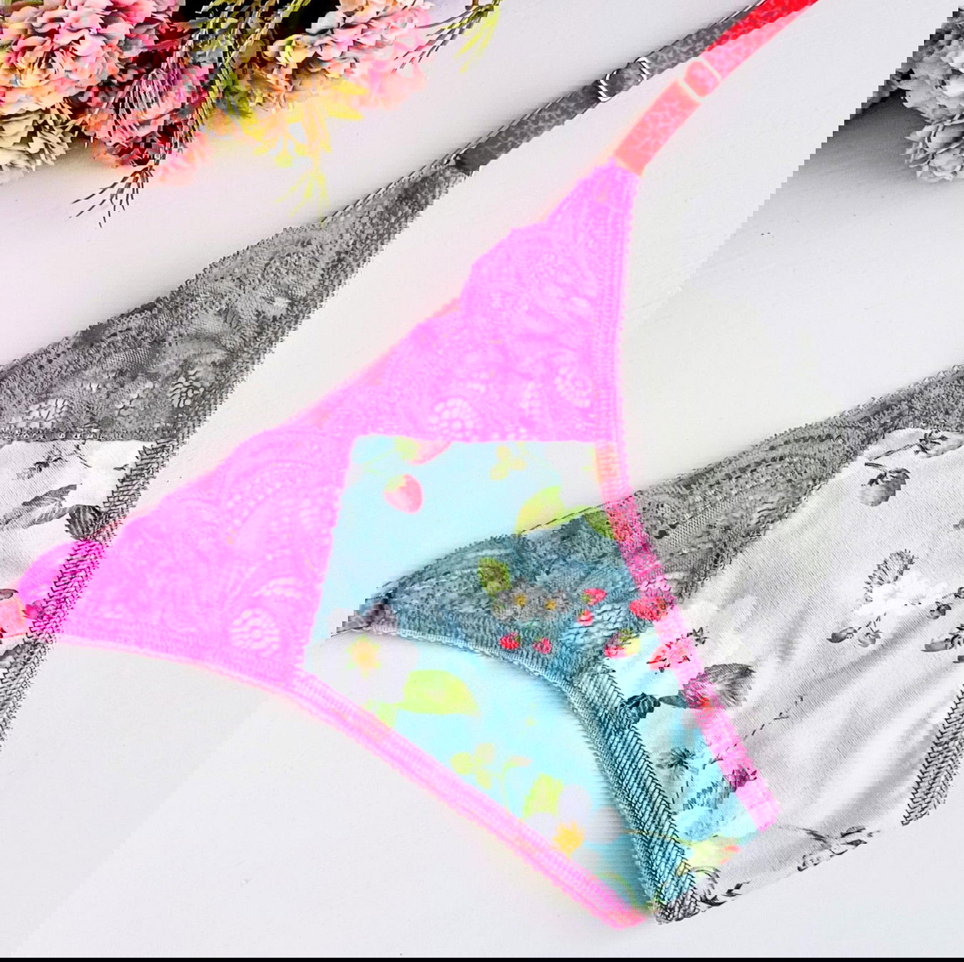 Tanga cola less confeccionada en modal estampado de guindas con detalles en puntilla cereza.