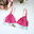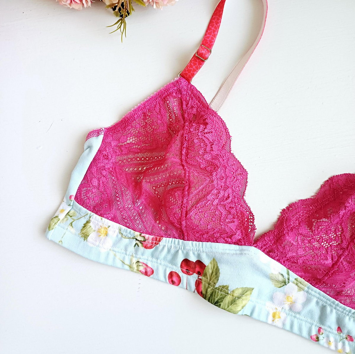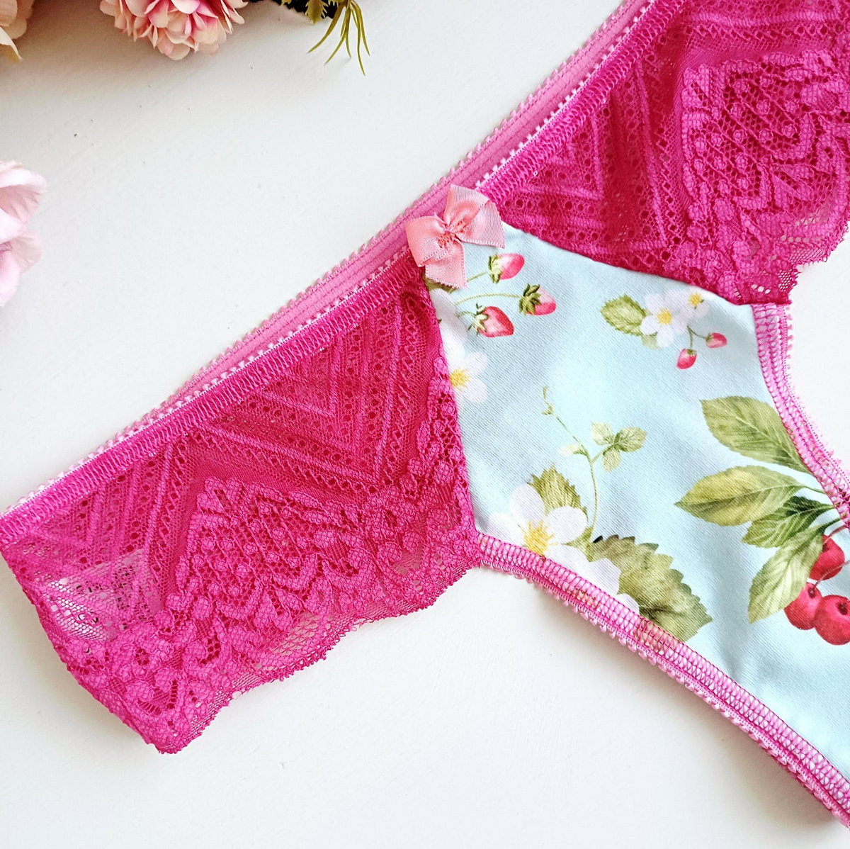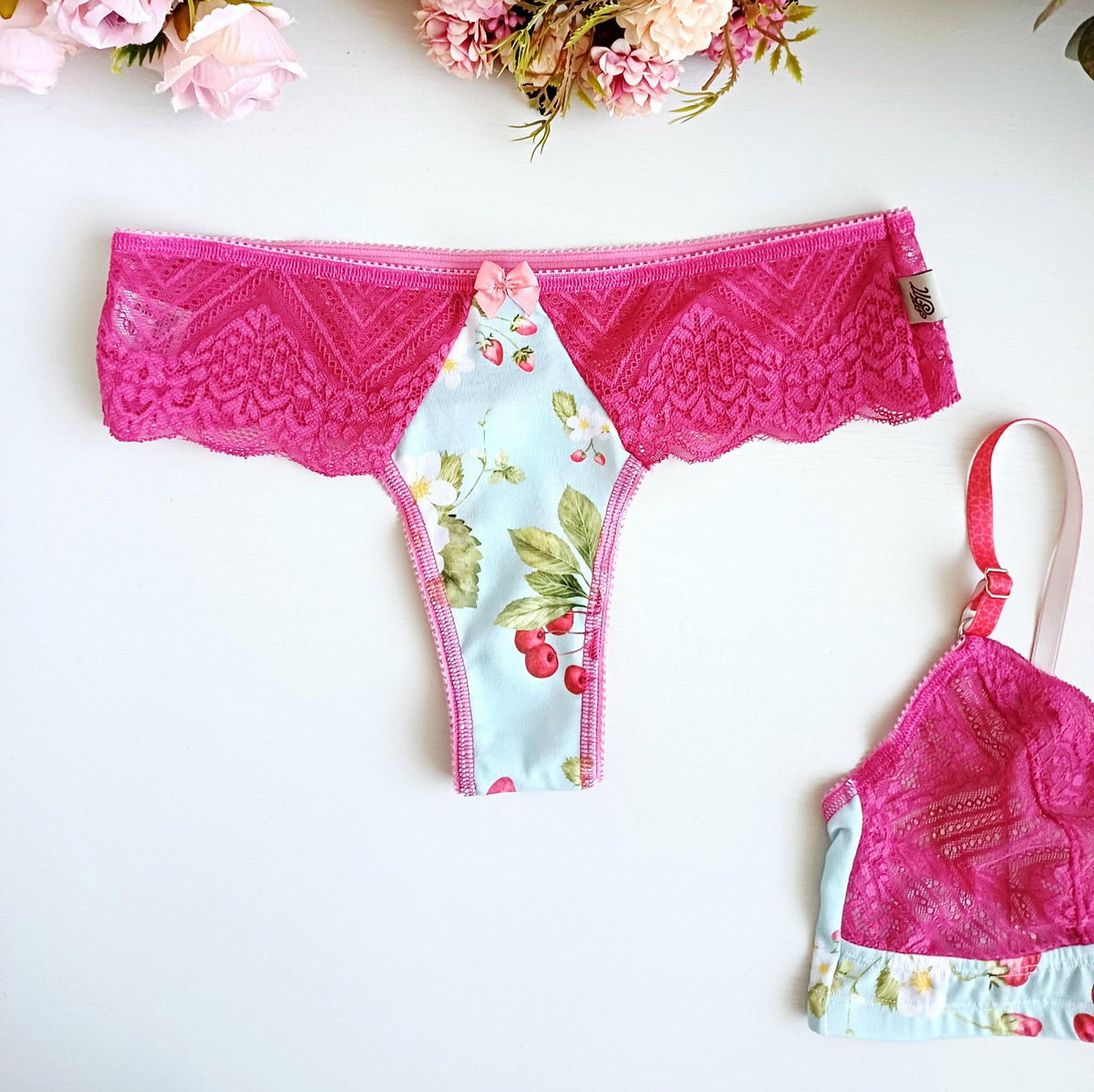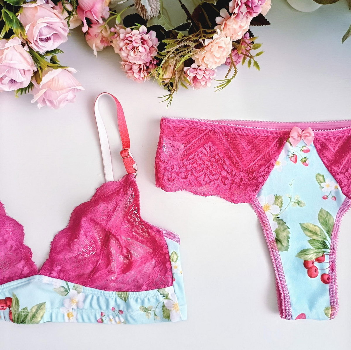 Conjunto de corpiño y bombacha colaless confeccionado en modal estampado de guindas y puntilla color cereza. Breteles de corazón regulables.