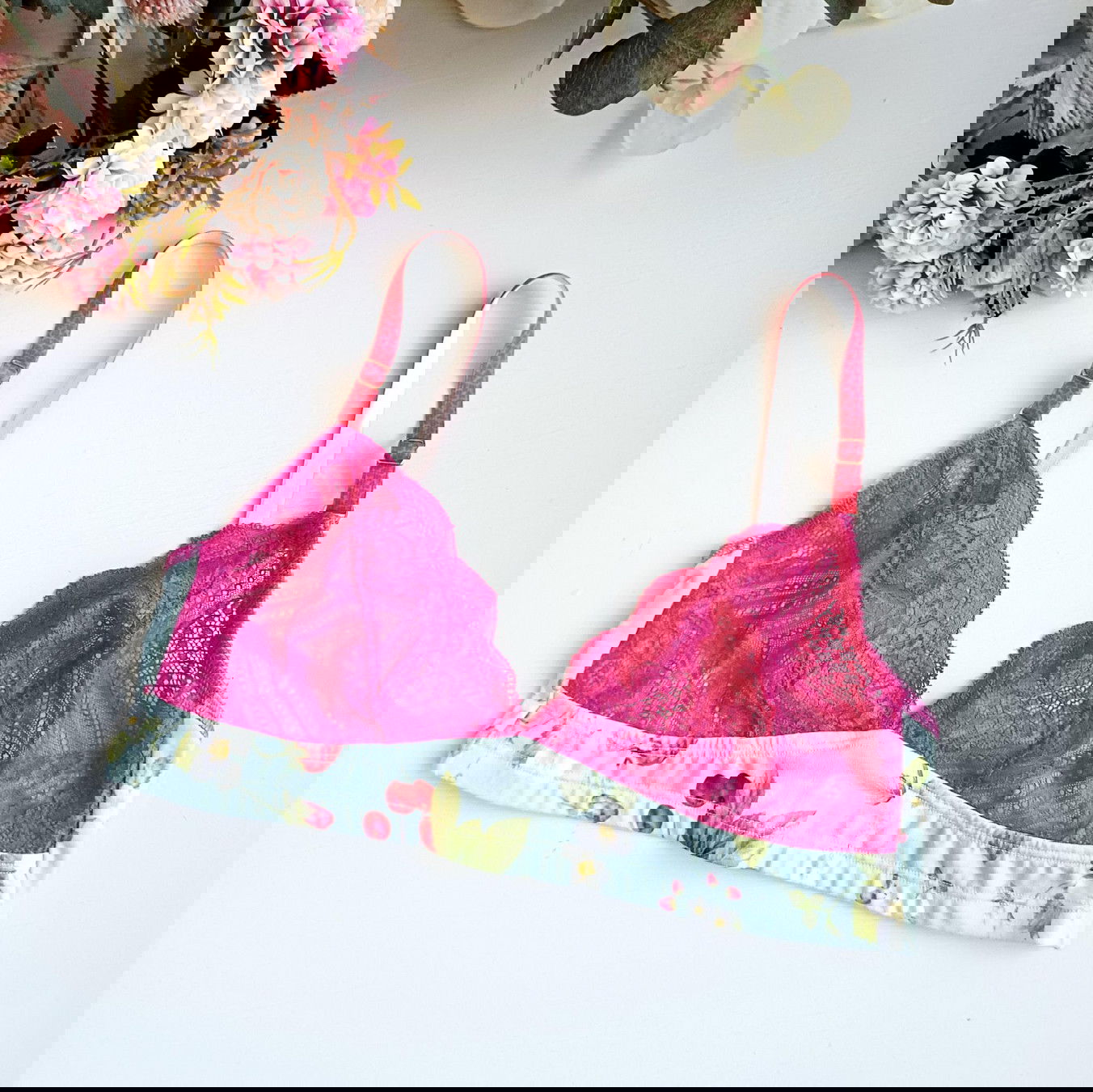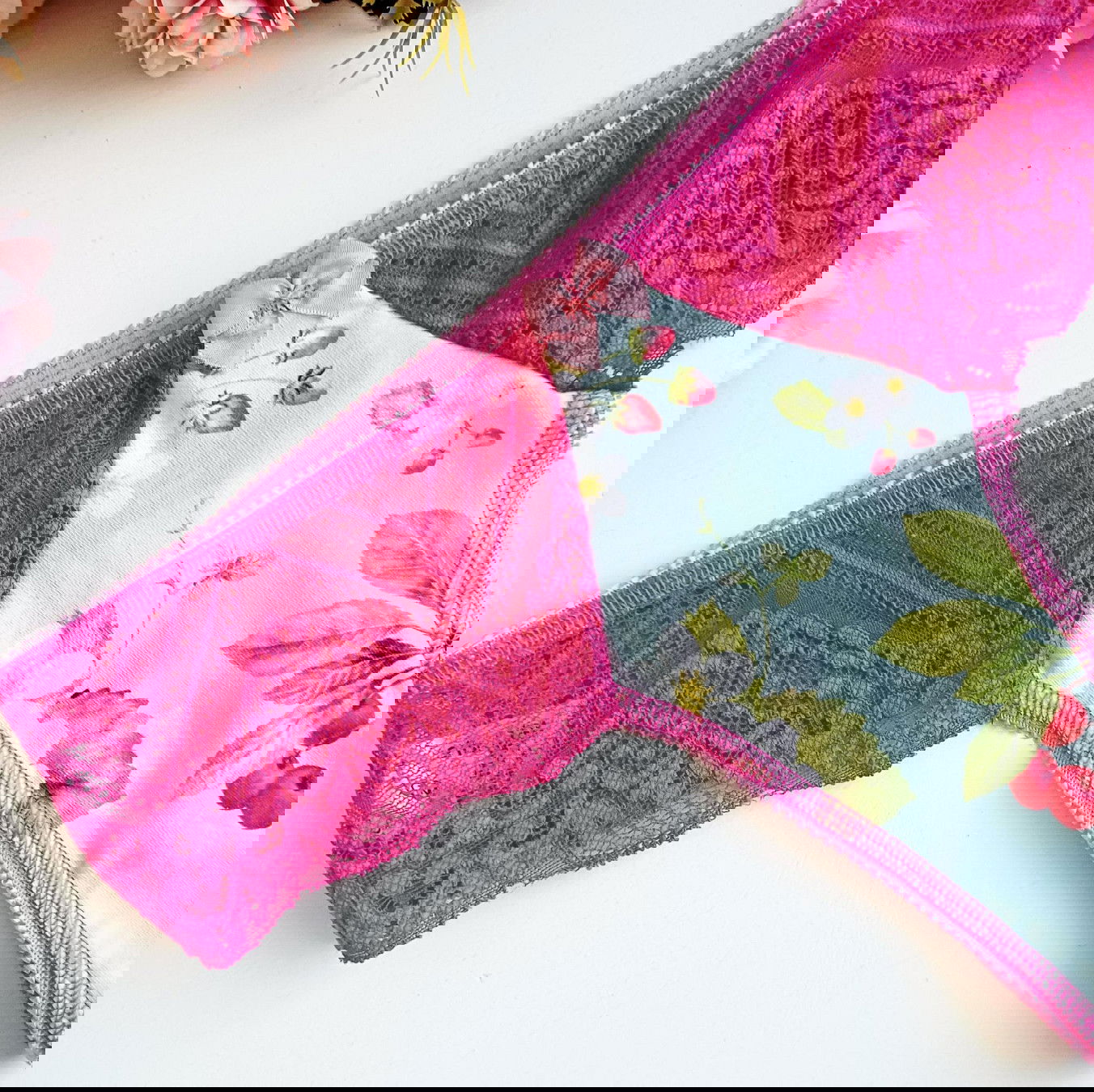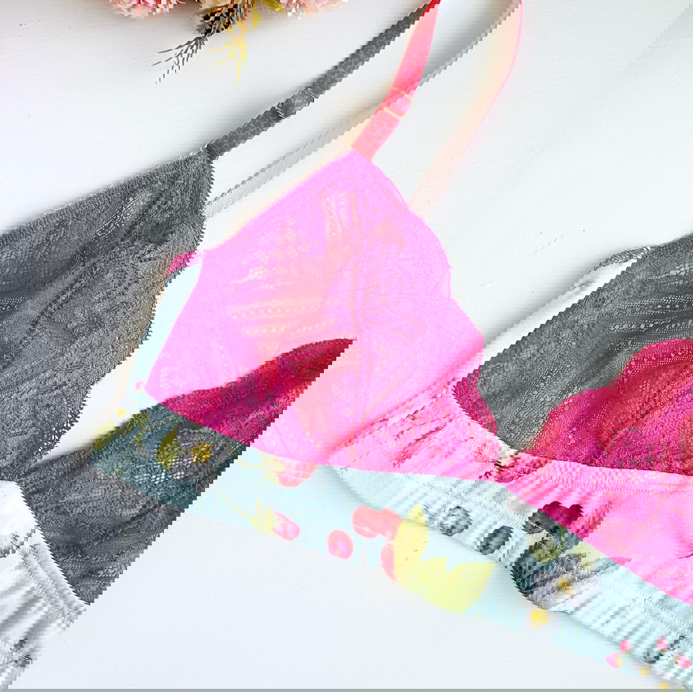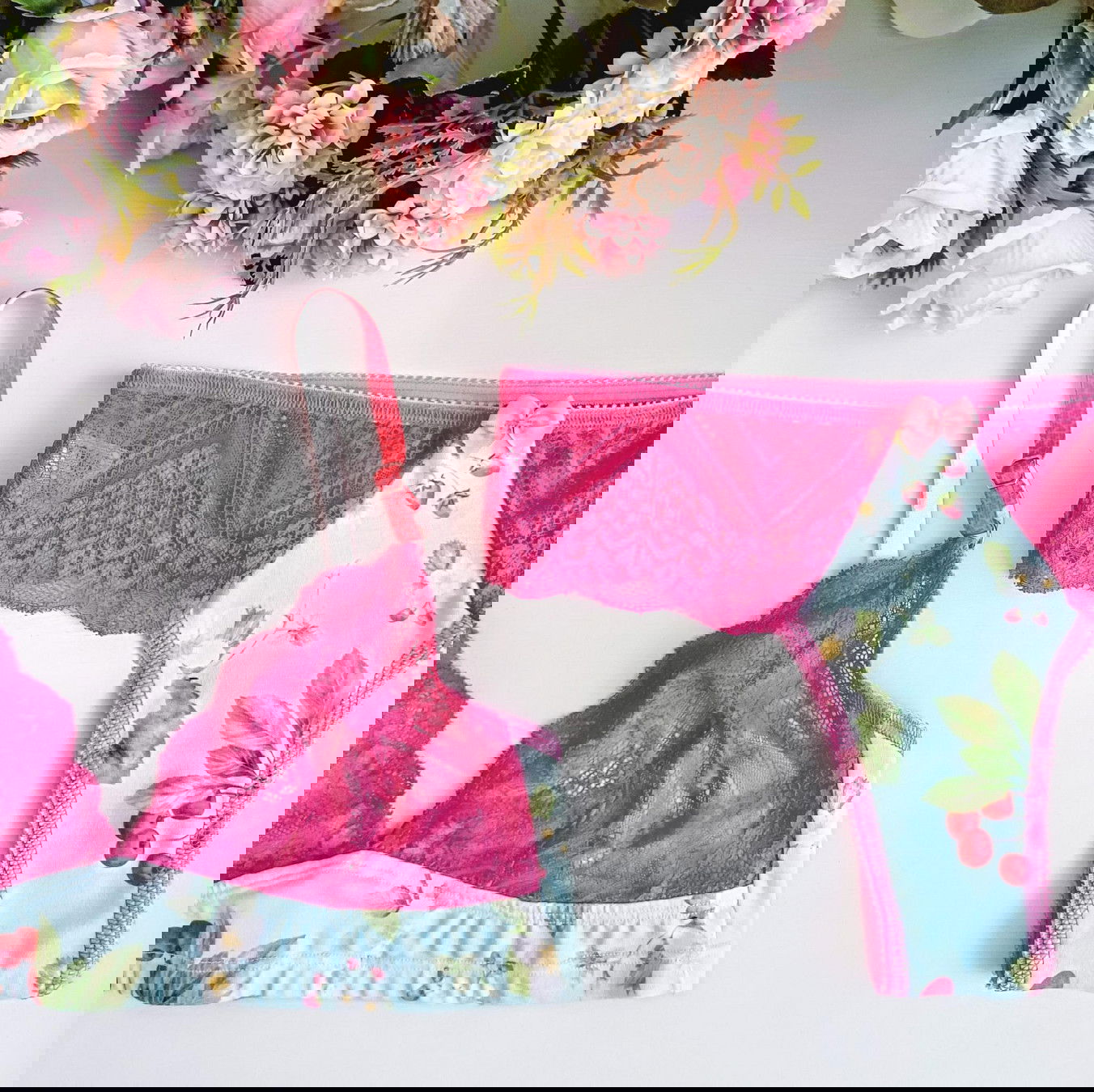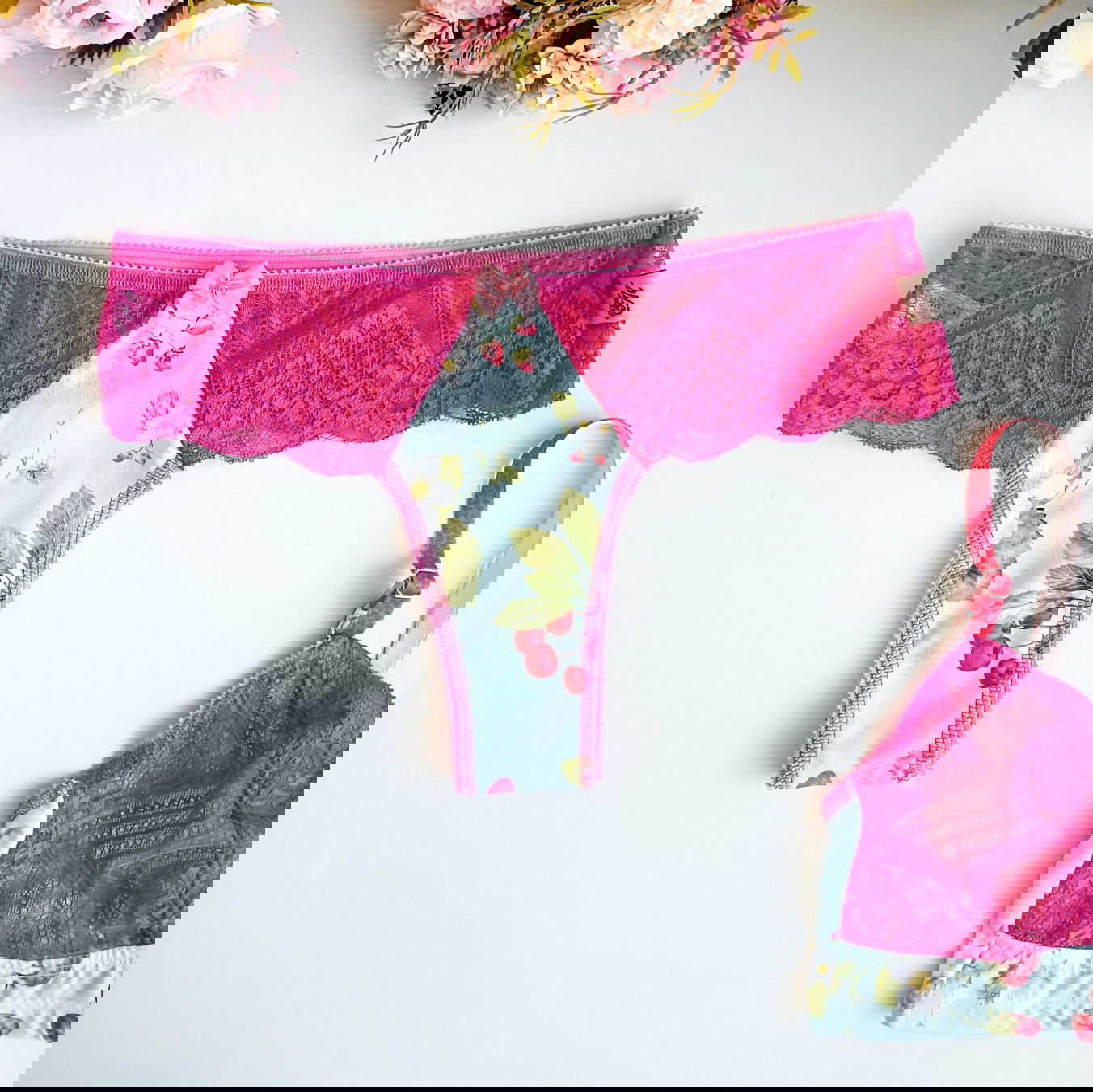 Conjunto de corpiño y bombacha colaless confeccionado en modal estampado de guindas y puntilla color cereza. Breteles de corazón regulables.