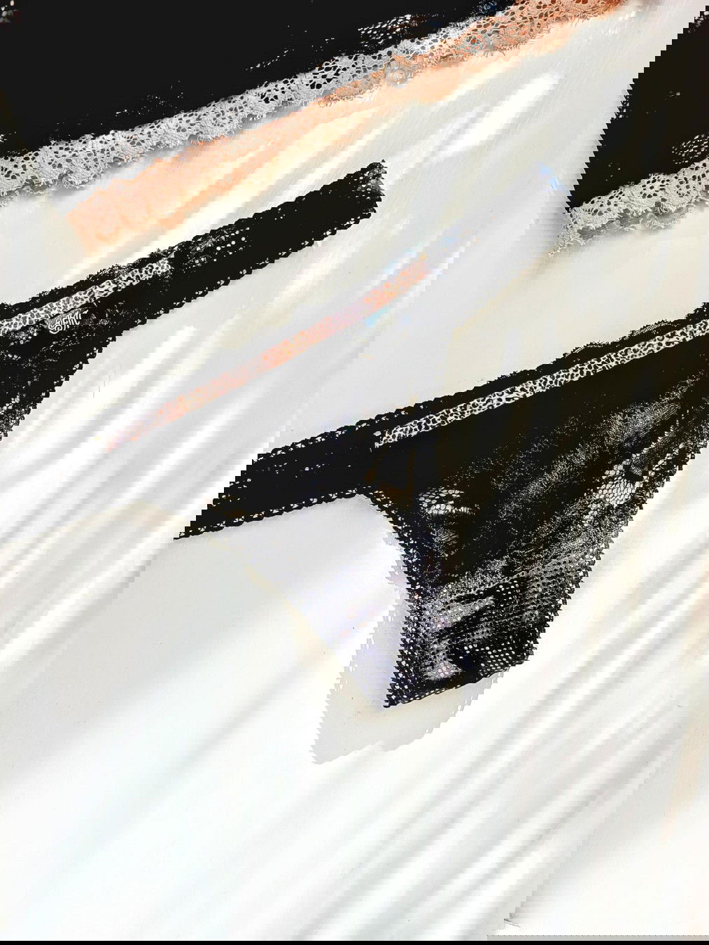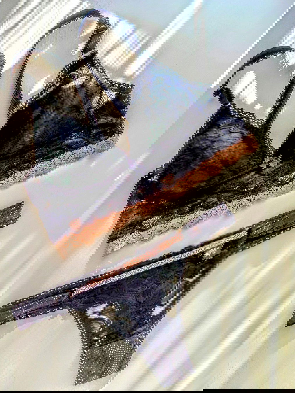 Conjunto de corpiño triángulo taza soft y bombacha cola less confeccionada en puntilla negra con detalles en puntilla tostada.