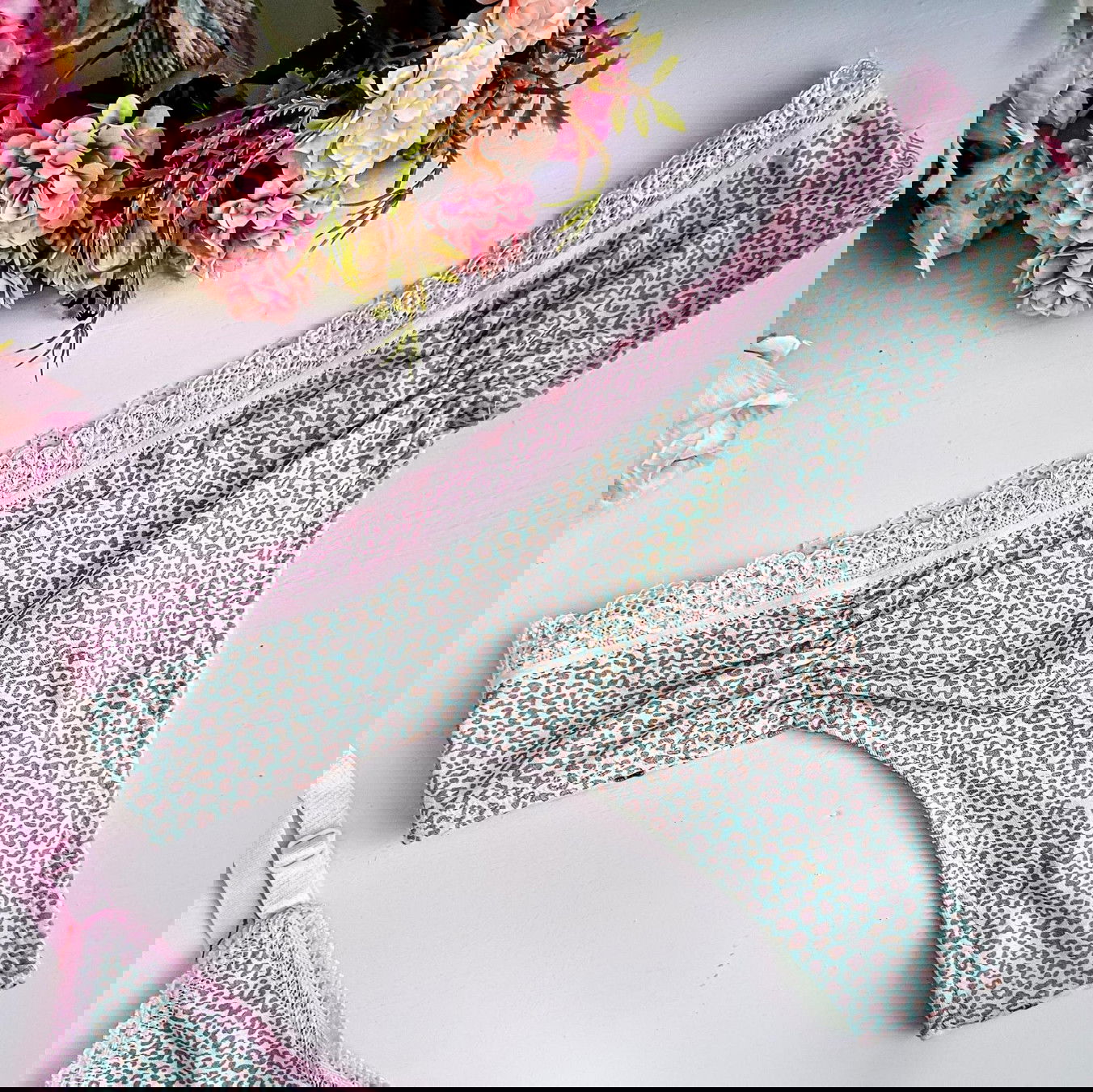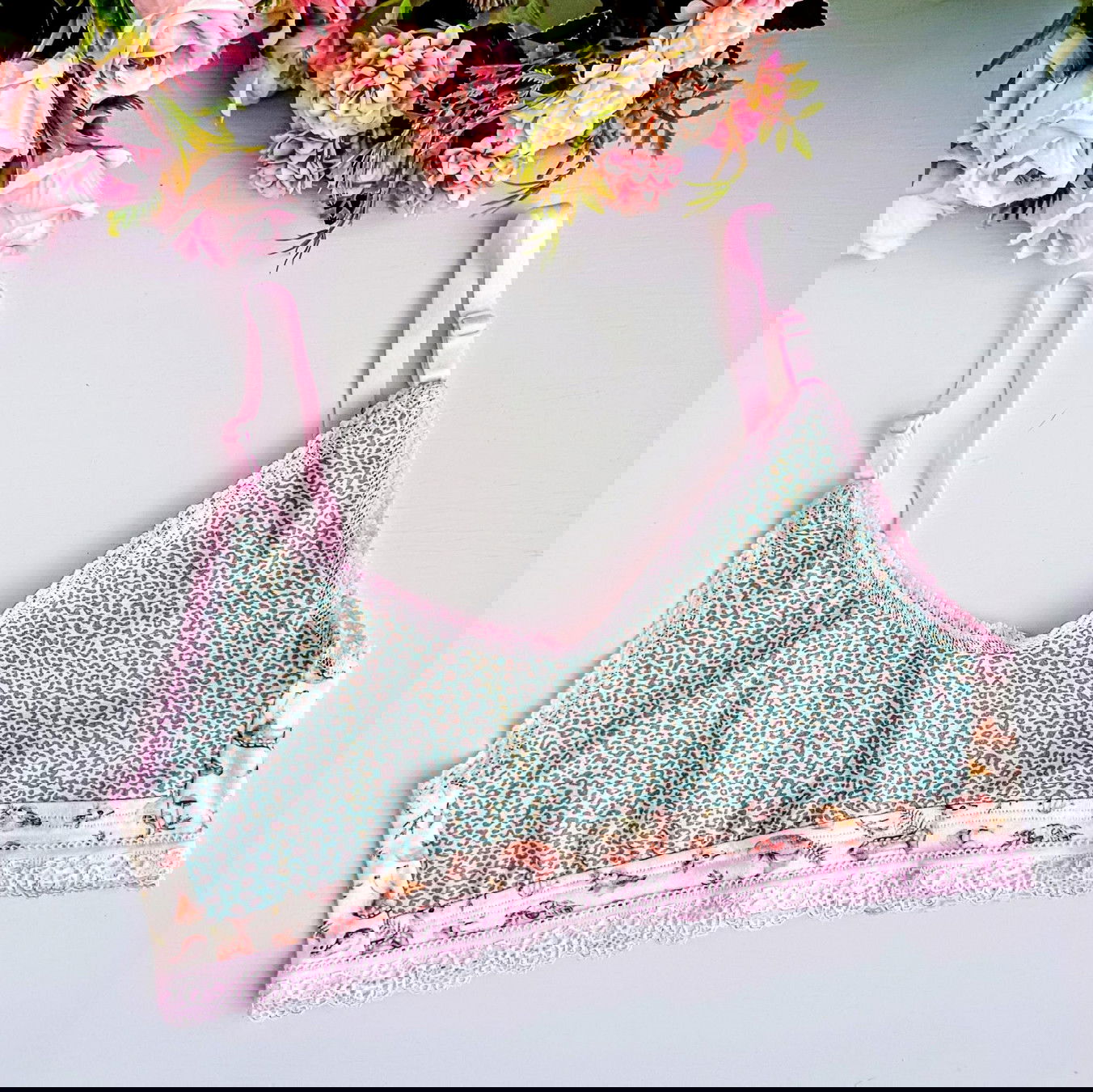 Conjunto de corpiño tipo top (con gancho) y bombacha colaless con detalle de funce, confeccionado en algodon estampado print y bambi.