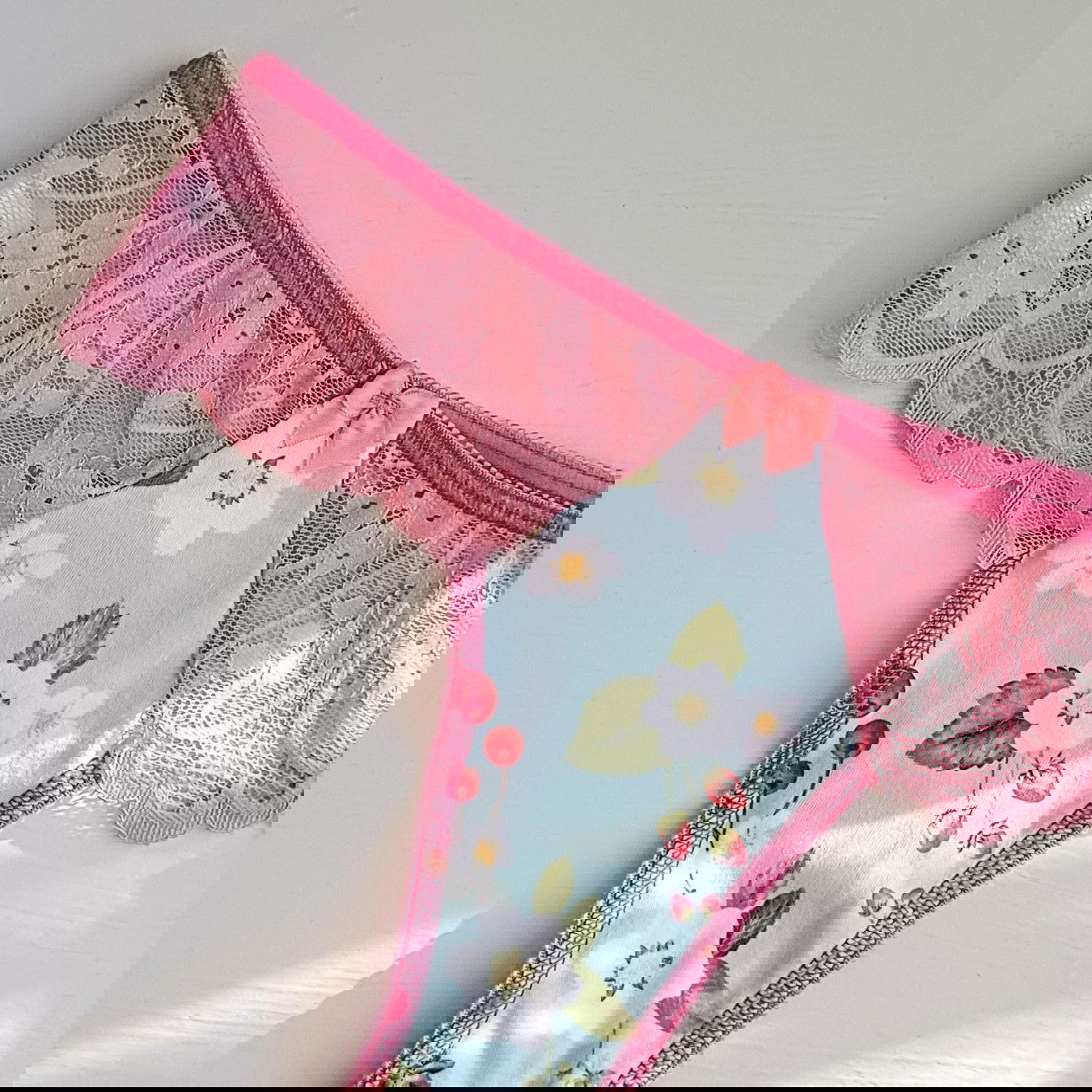 Bombacha cola less confeccionada en modal estampado de guindas y puntilla rosa.