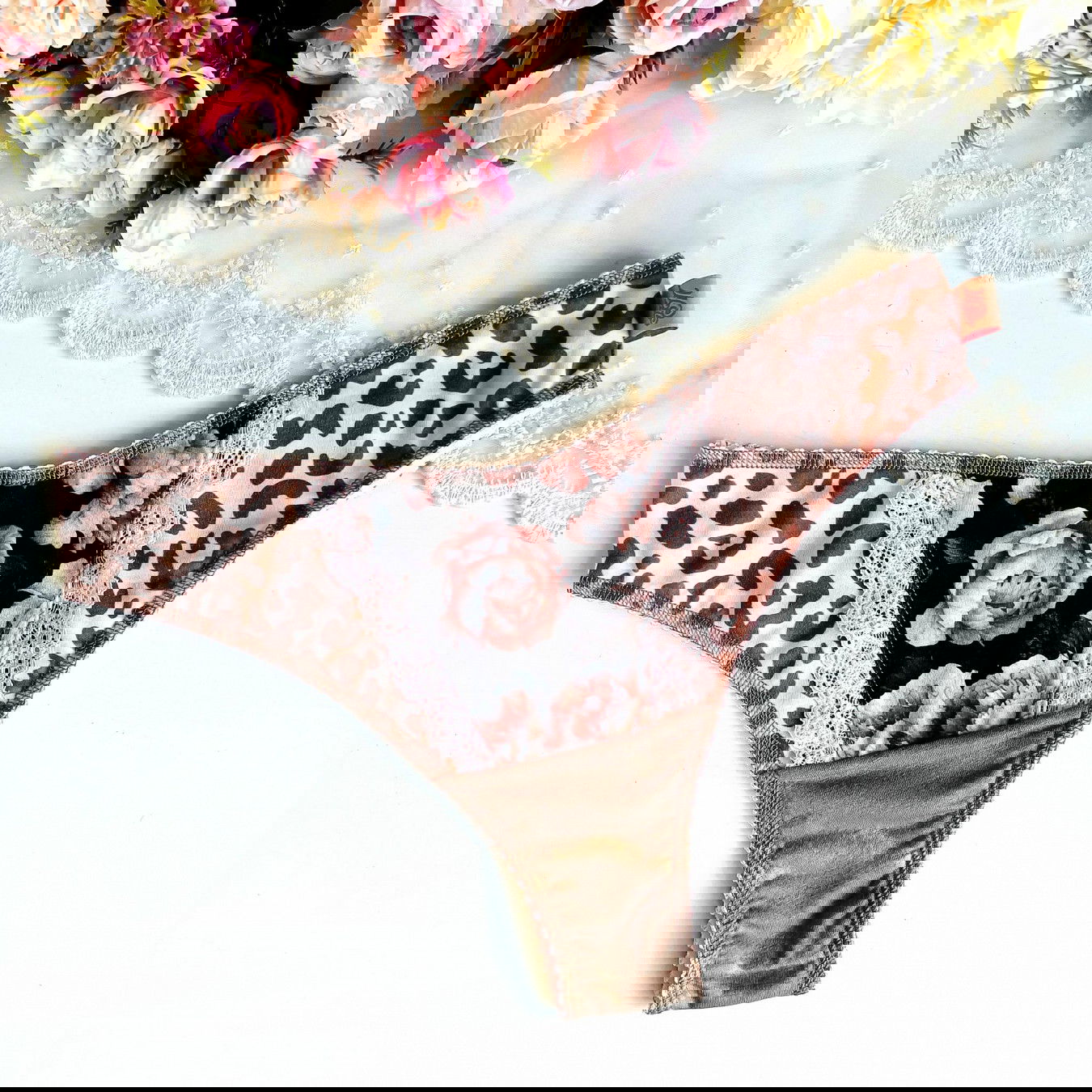 Bombacha cola less confeccionado en algodón estampado de flores chocolate combinado con animal print rosa.