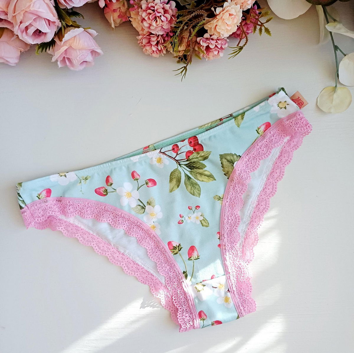 Vedetina confeccionada en modal estampado de guindas,con detalle de puntilla rosa en contorno de piernas.