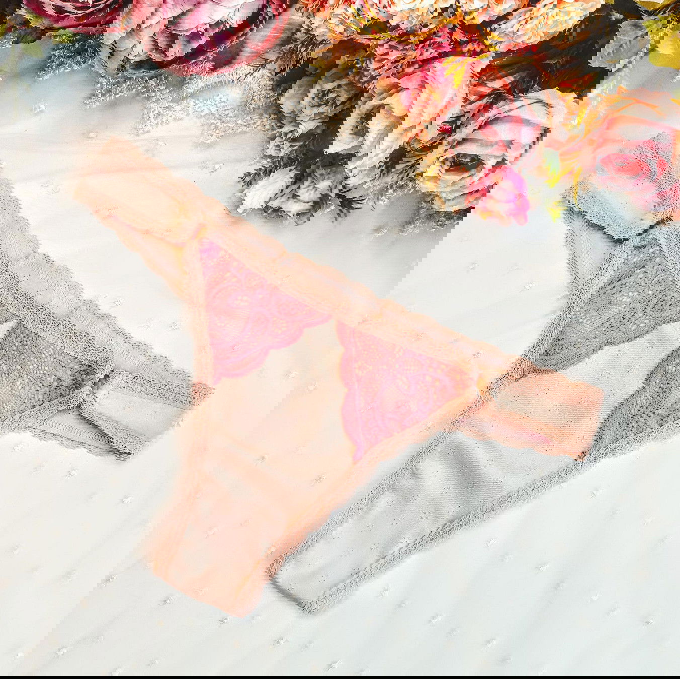 Bombacha cola less con detalle de argollas en microfibra calada rosada con detalles en puntilla fucsia.