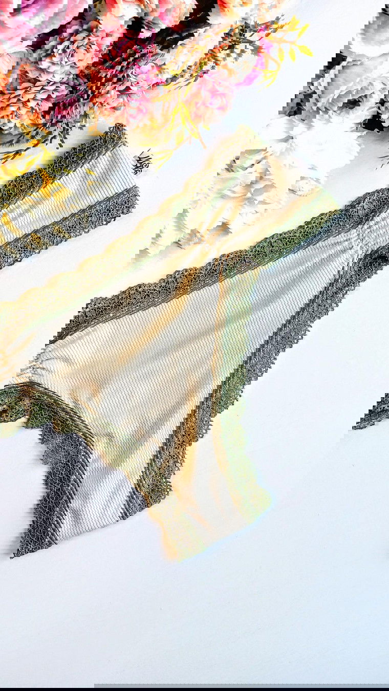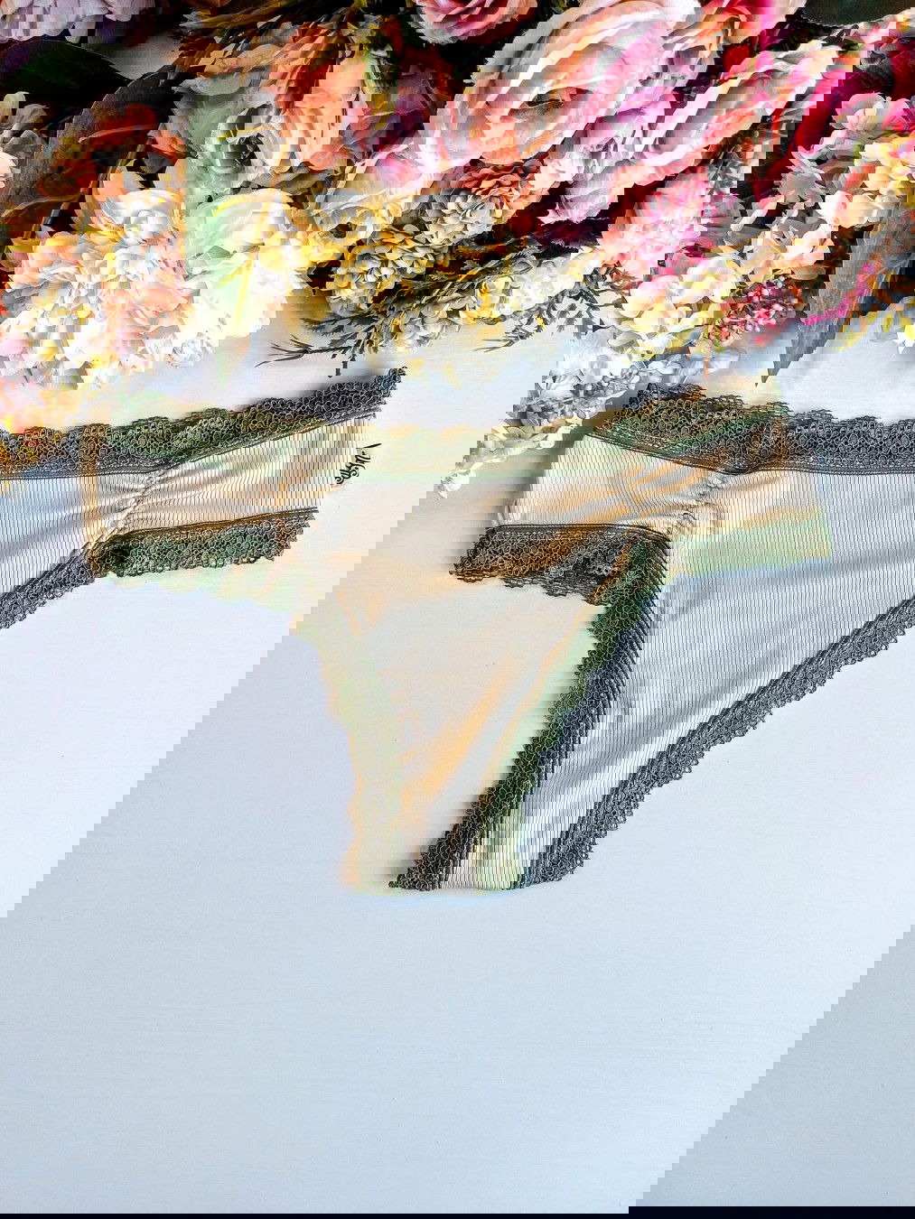 Bombacha cola less confeccionada en morley liso beige, con detalle de puntilla en el contorno de la cintura y las piernas. El color de la puntilla verde seco. Con detalle de frunce en el delantero.