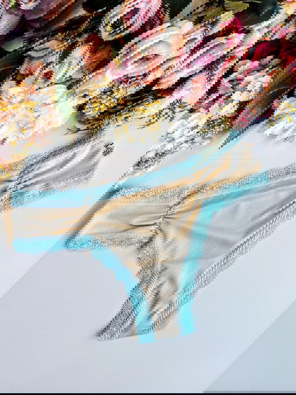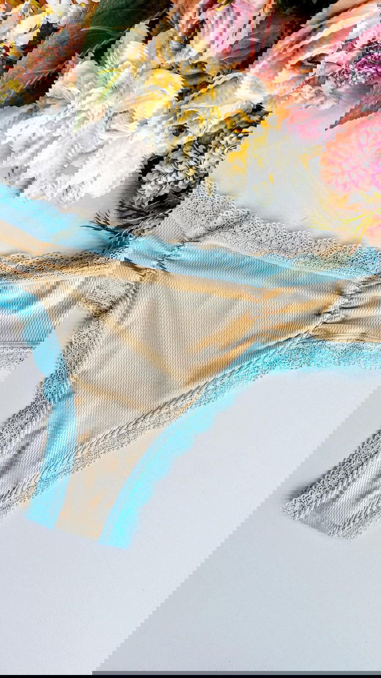 Bombacha cola less confeccionada en morley liso beige, con detalle de puntilla en el contorno de la cintura y las piernas. El color de la puntilla celeste. Con detalle de frunce en el delantero.