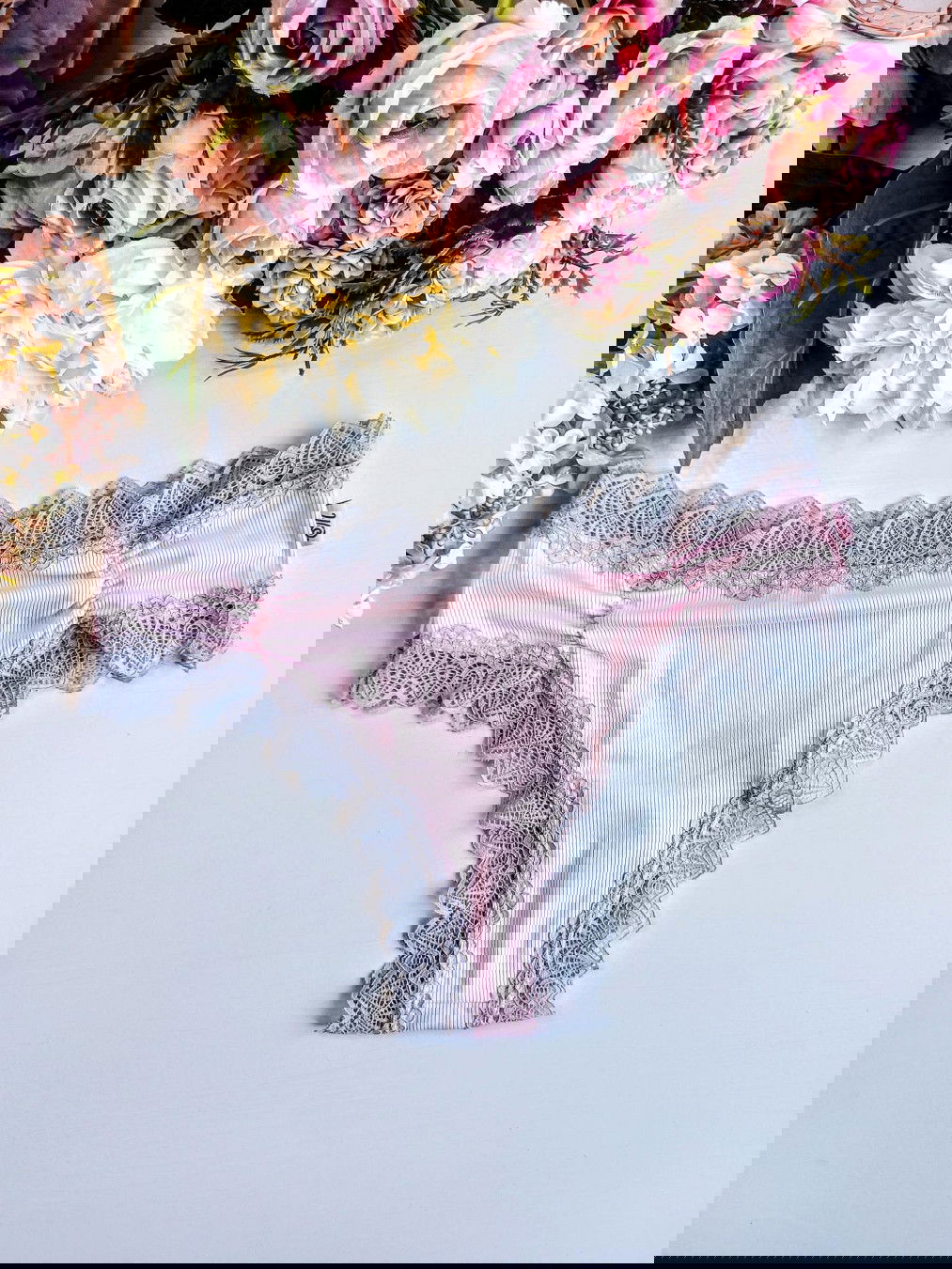 Bombacha cola less confeccionada en morley liso rosa, con detalle de puntilla en el contorno de la cintura y las piernas. El color de la puntilla es gris.