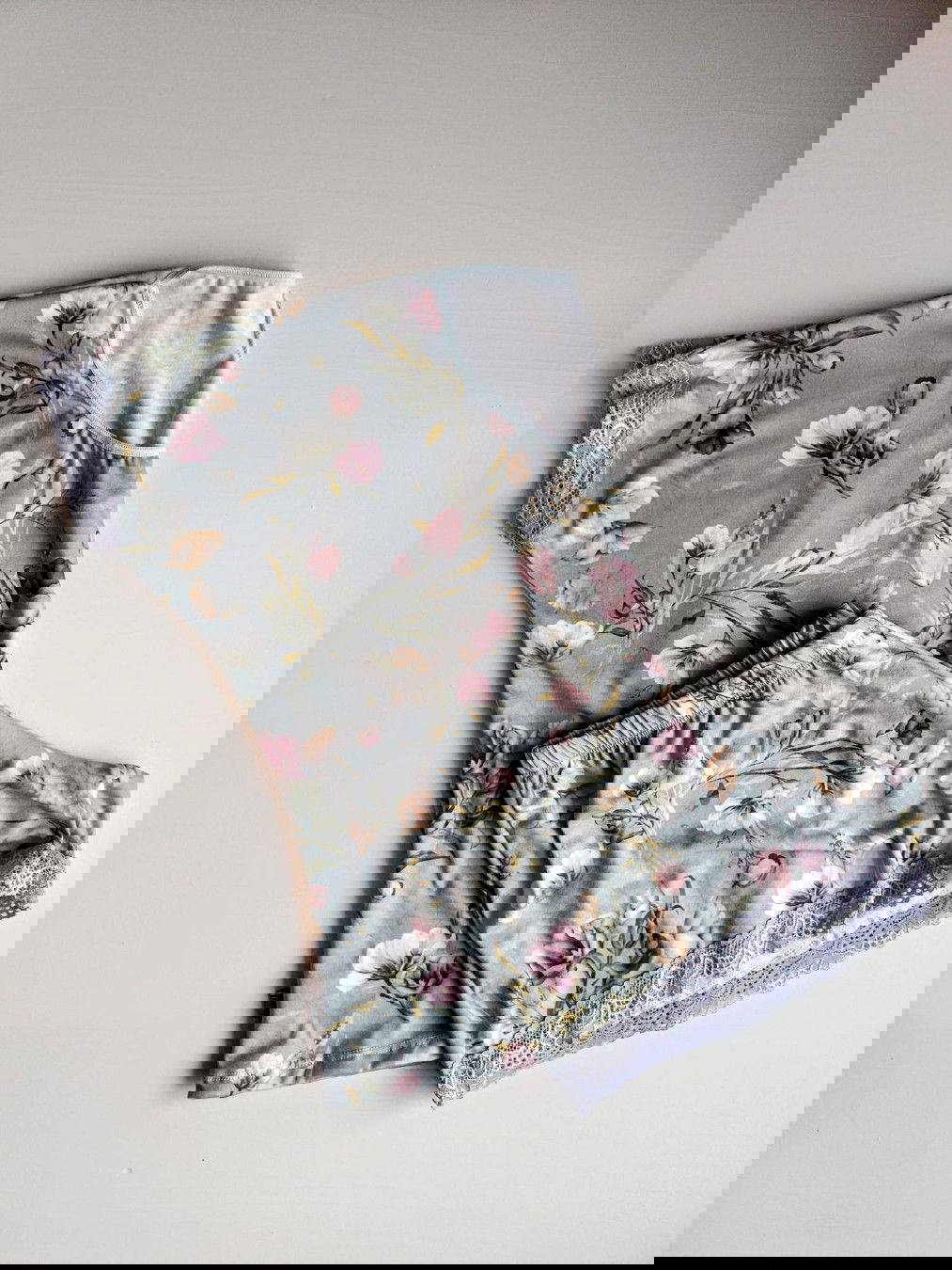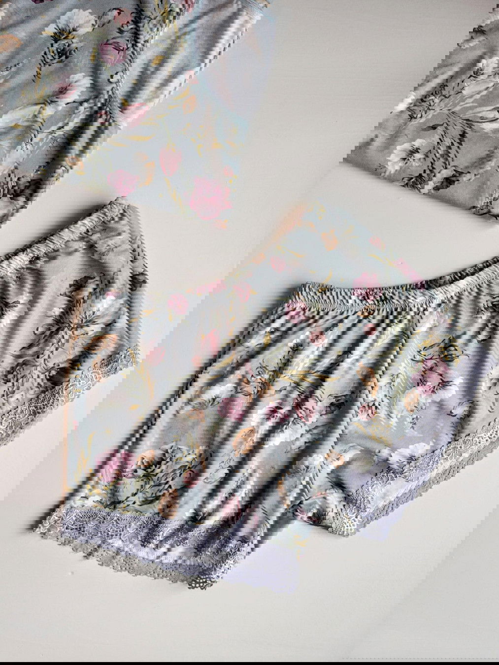Pijama de remera manga japonesa y short, confeccionado en modal estampado de flores sobre fondo gris.
