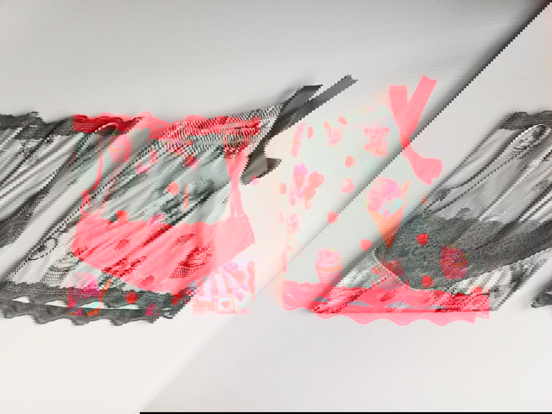 Pijama de musculosa con breteles regulables y short, confeccionado en algodón fino estampado, con detalles de puntilla roja.