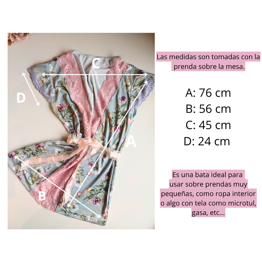 Bata confeccionada en modal estampado de flores sobre fondo gris, con detalle de puntilla rosa.