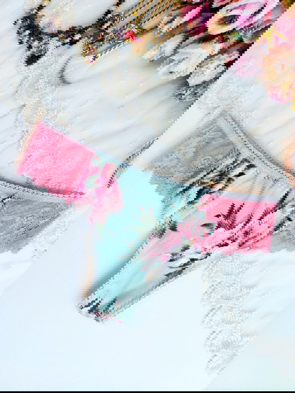 Culottin cola less confeccionado en modal estampado de flores sobre fondo celeste, con detalles en puntilla.