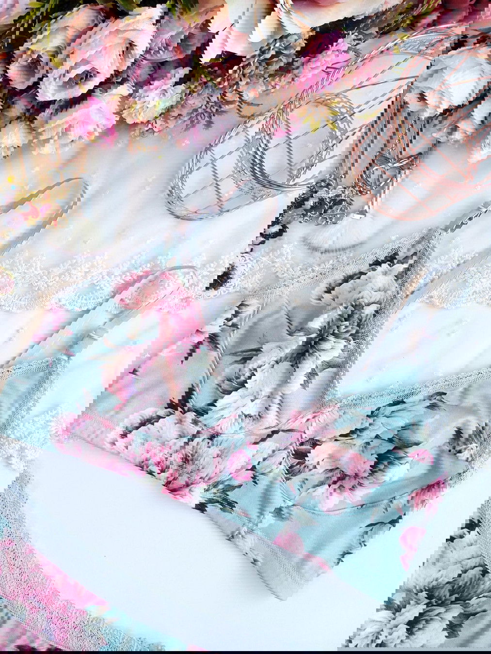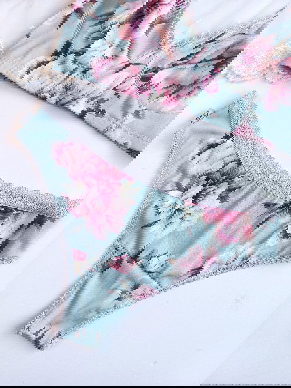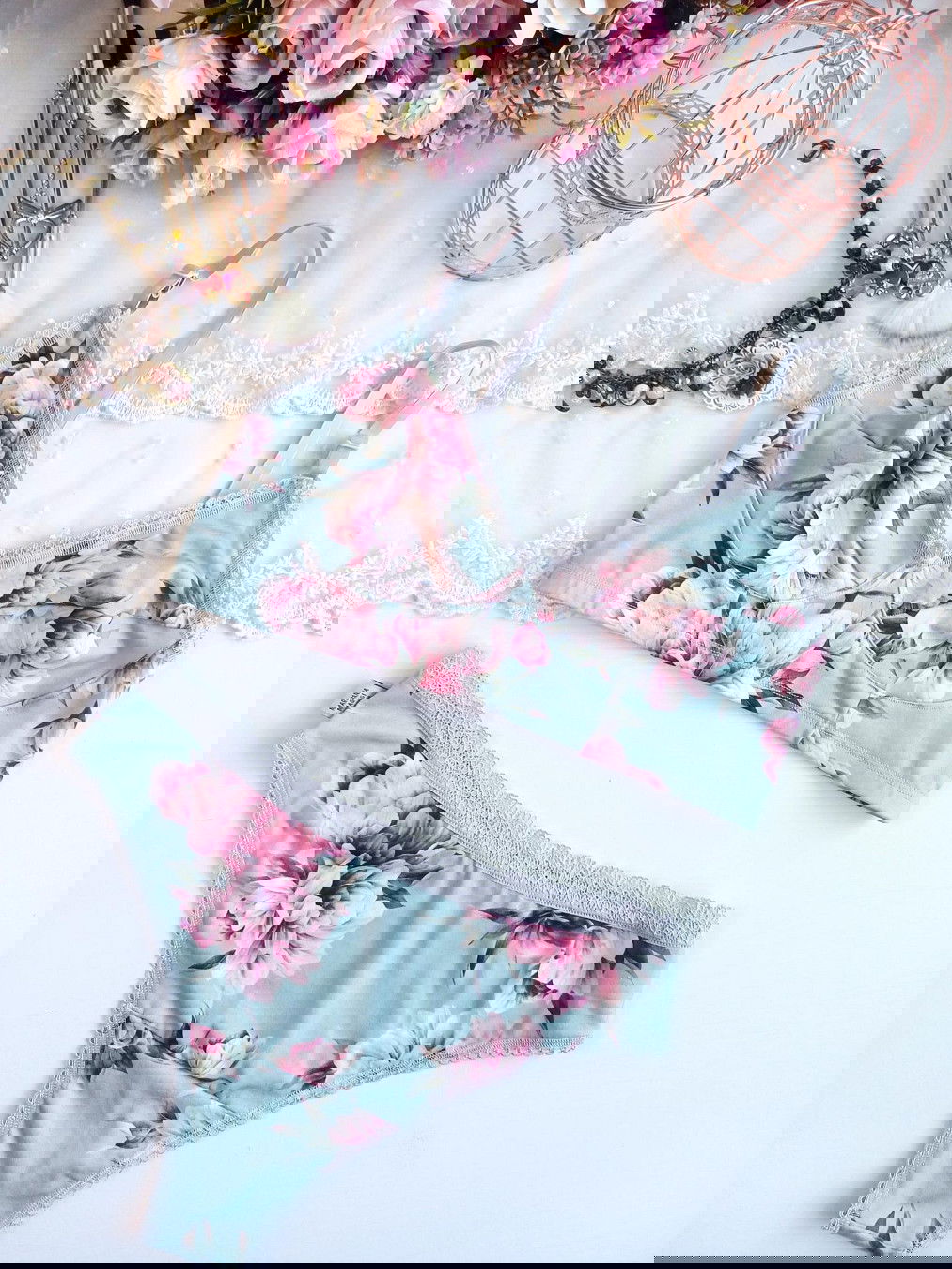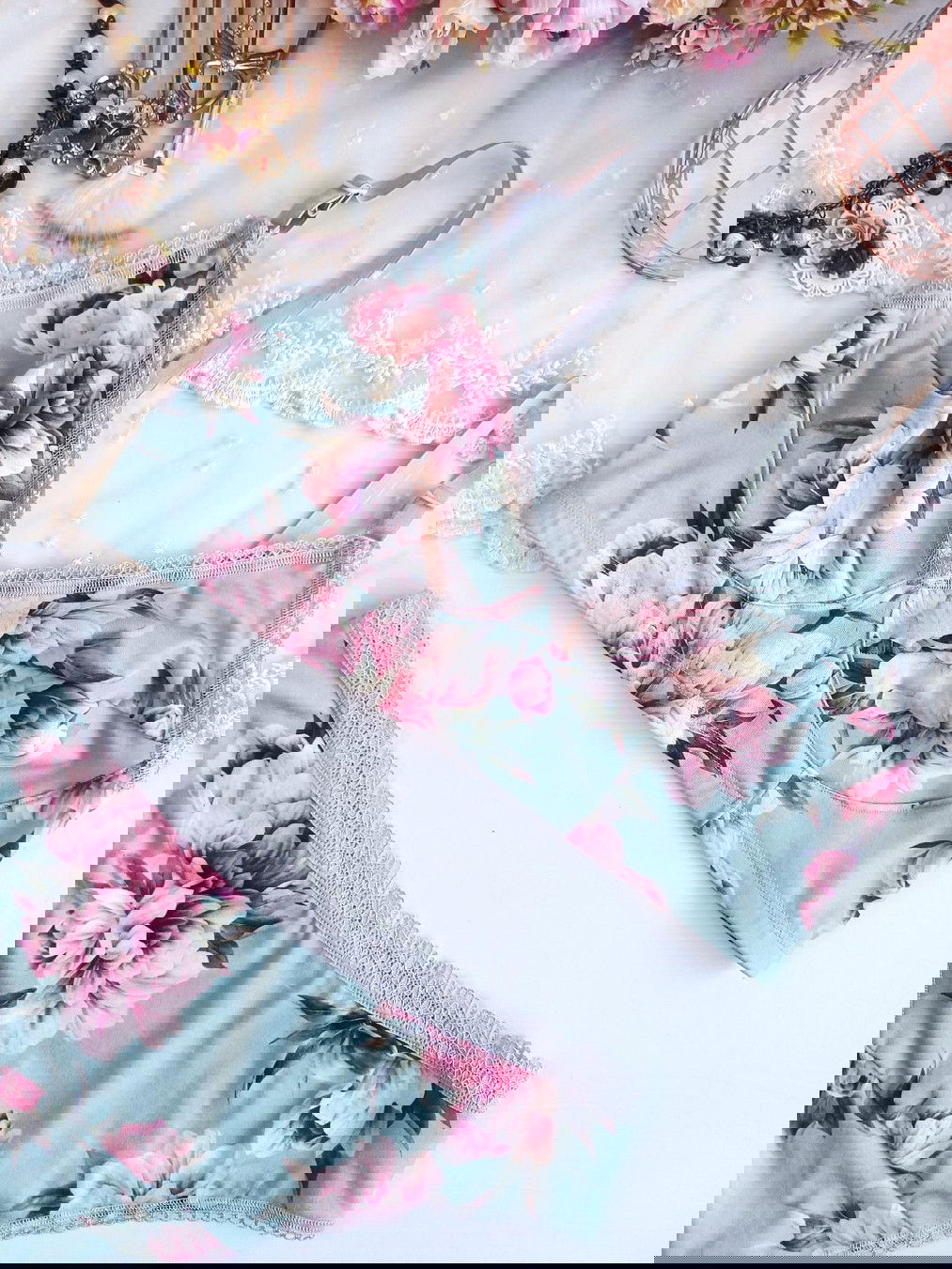 Conjunto de corpiño con recorte en el busto y bombacha cola less, confeccionado en modal estampado de flores sobre fondo celeste.