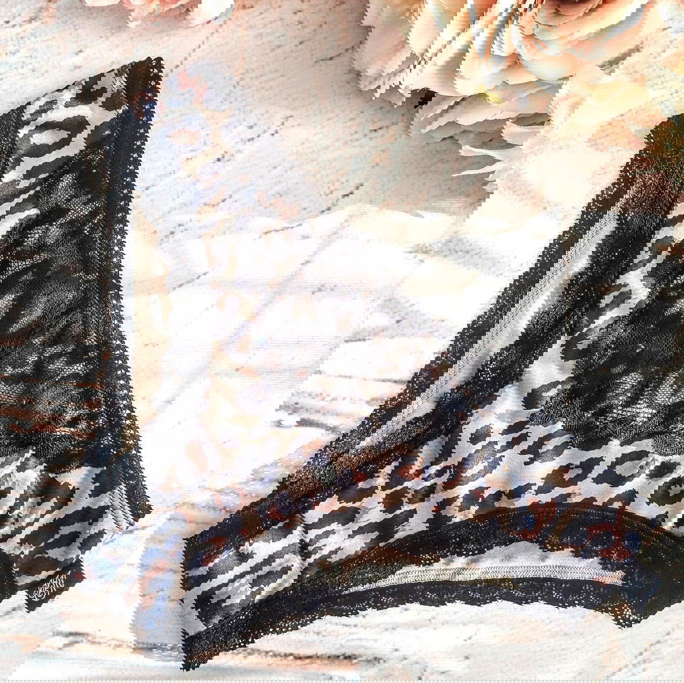 Vedetina confeccionada en lycra animal print tostado con detalles en puntilla negra.