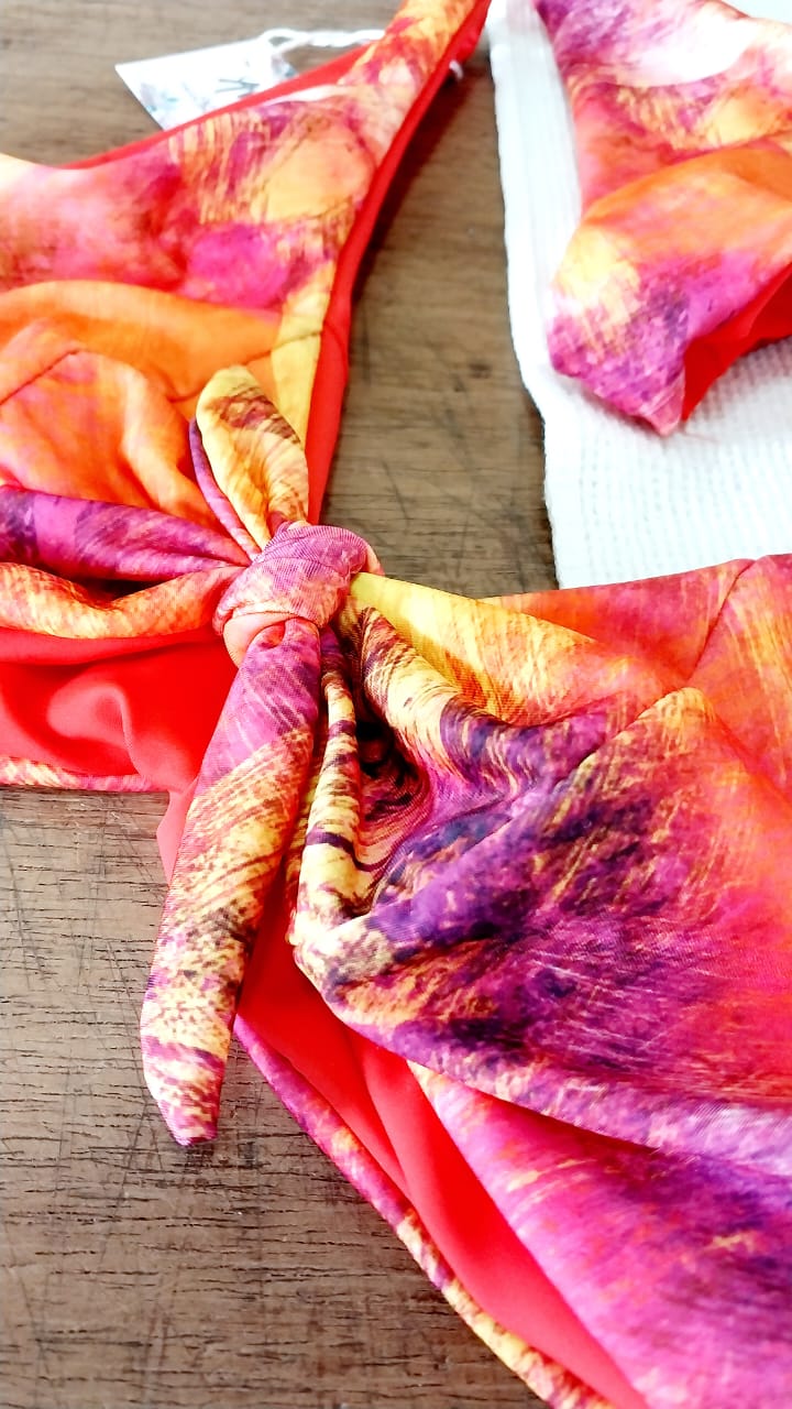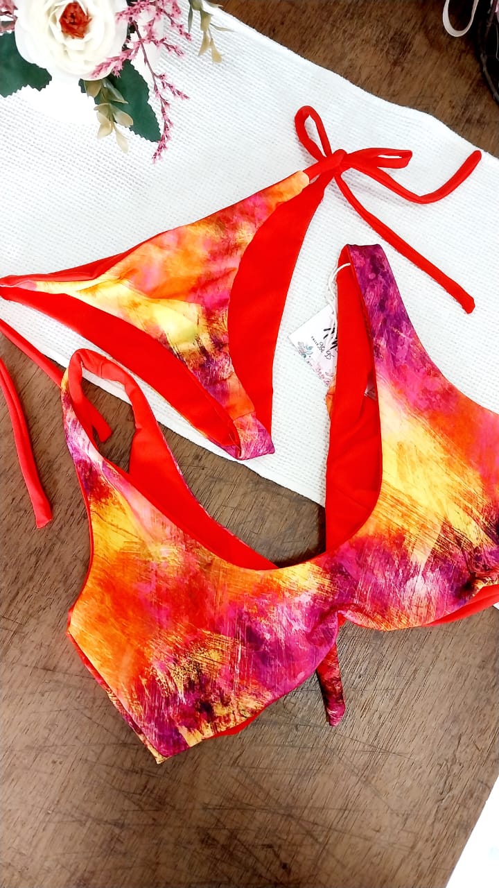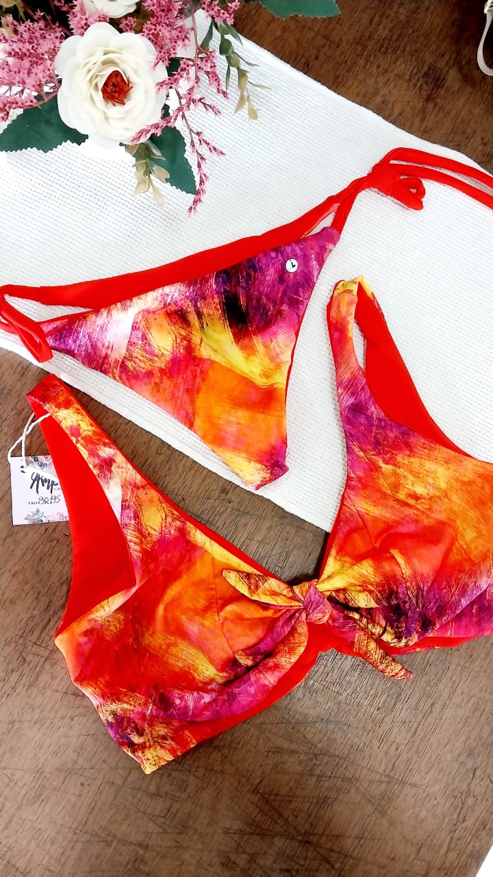 Corpiño corte triangulo, se regula atando en el pecho. Ajustable.