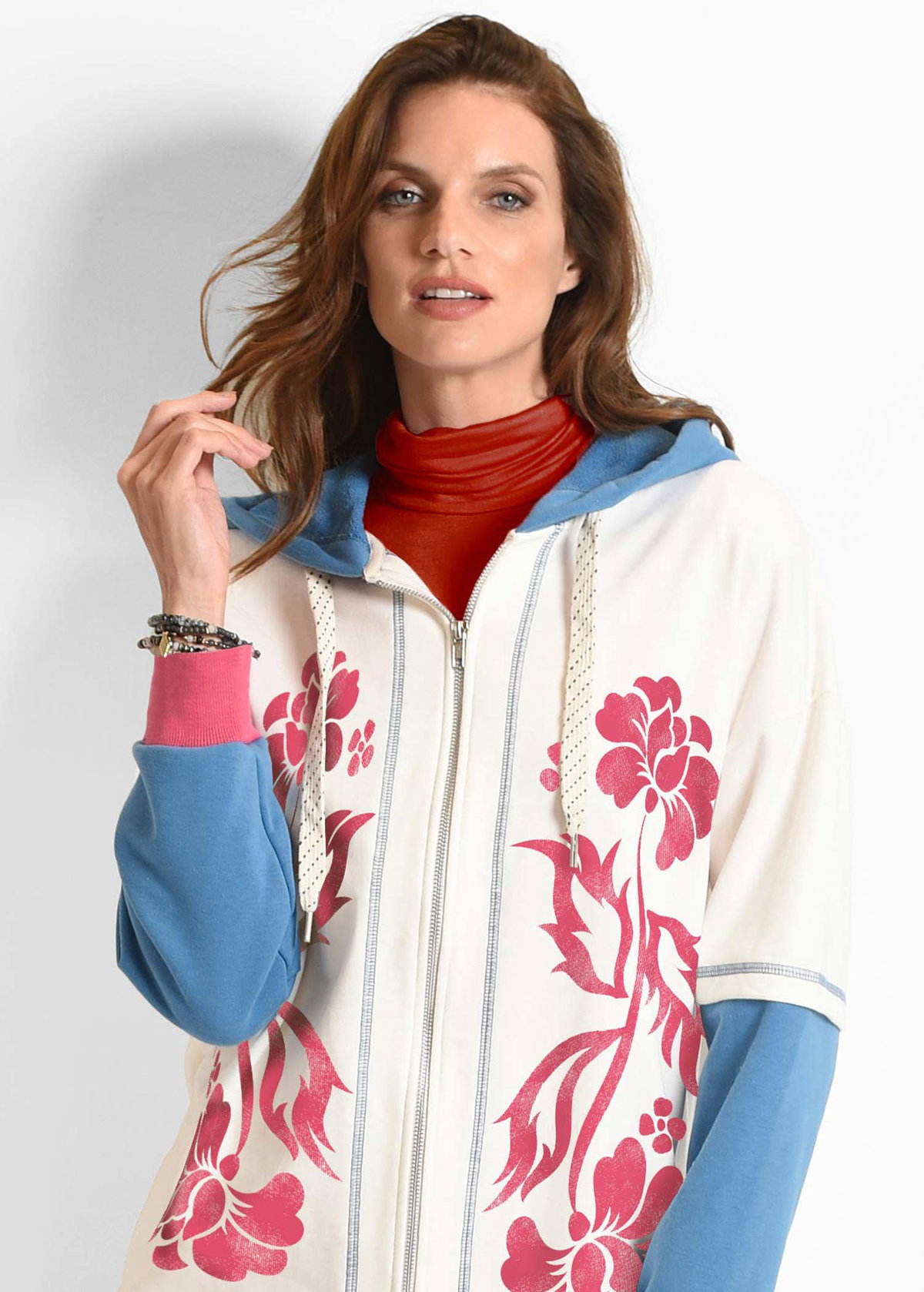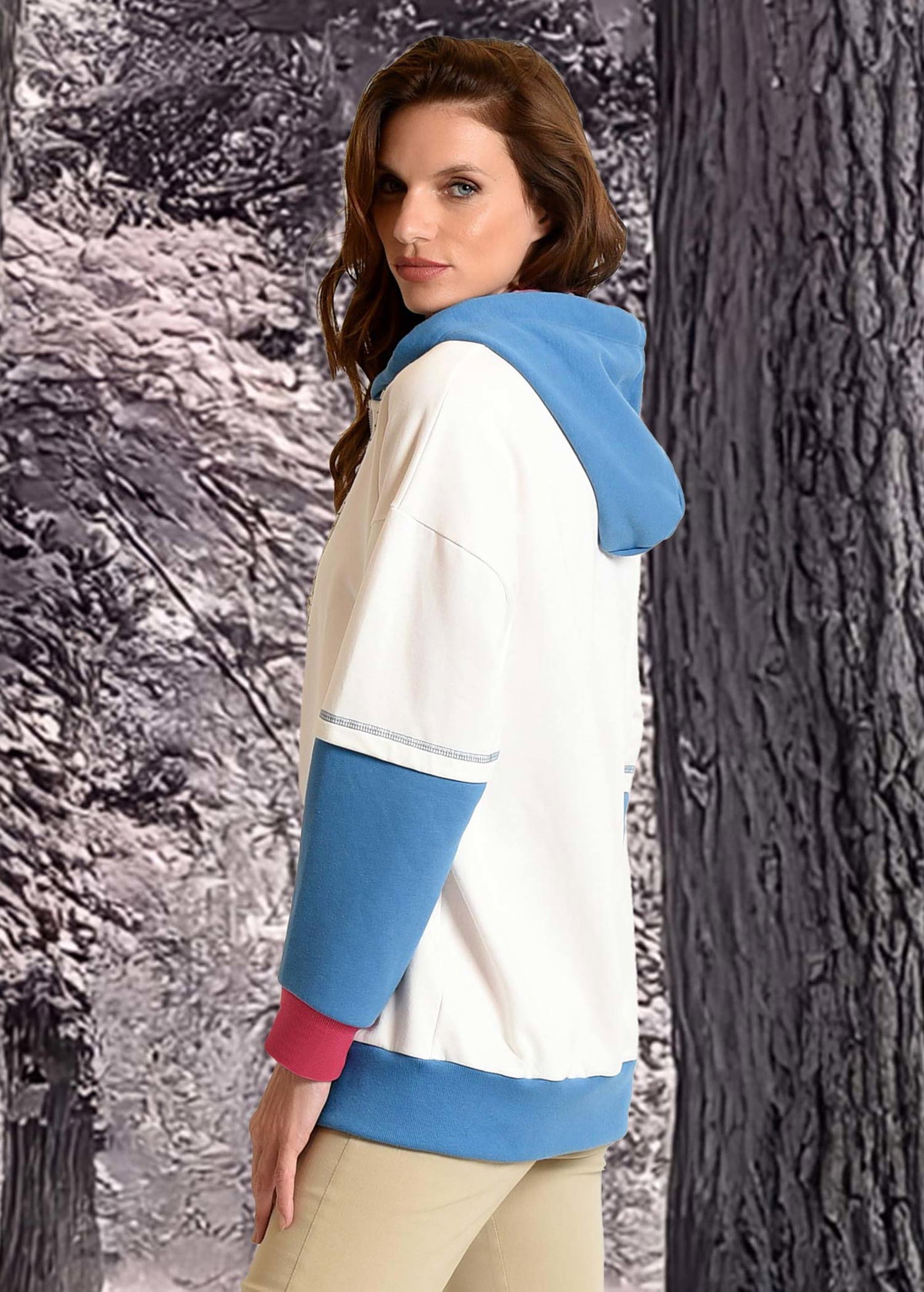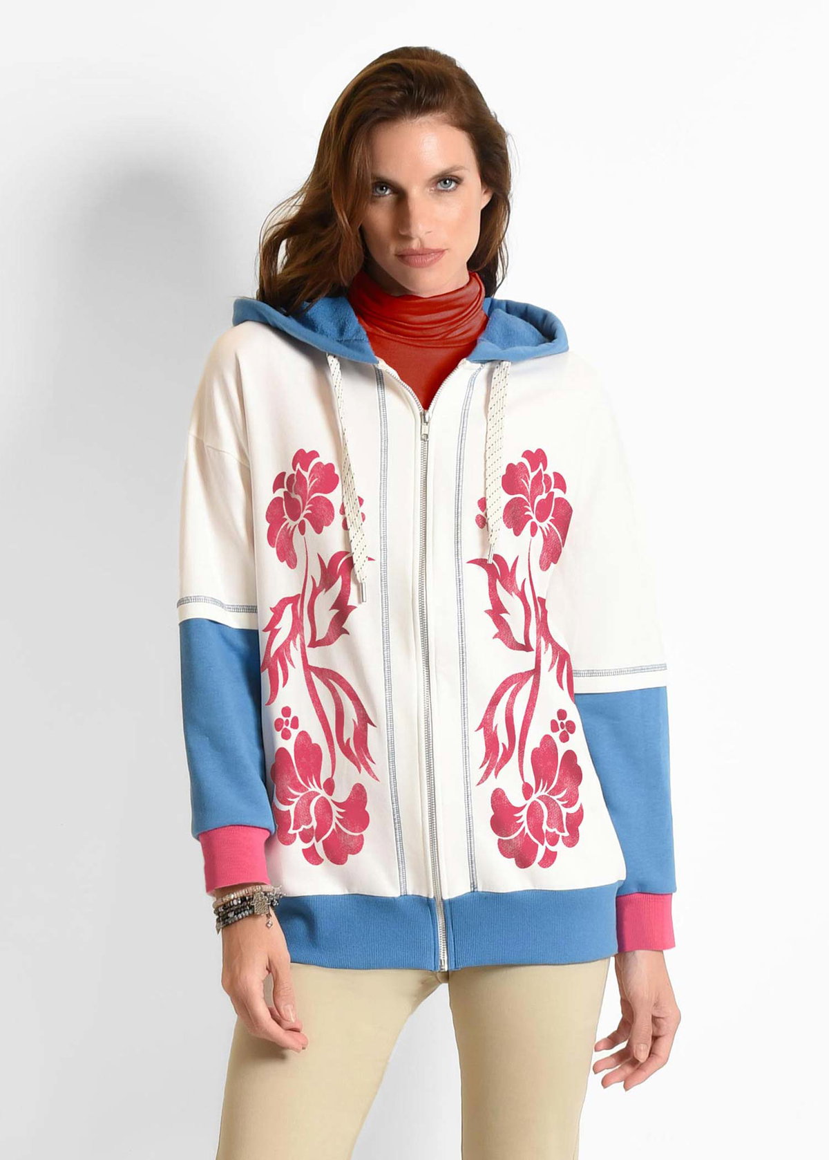Campera larga con capucha forrada. Delantero con estampa y detalles de bordador a contra color al igual que en mangas, que genera un efecto de superposición. Puños a contra color rayados hilado color. Realizada en rustico algodon Calce clásico