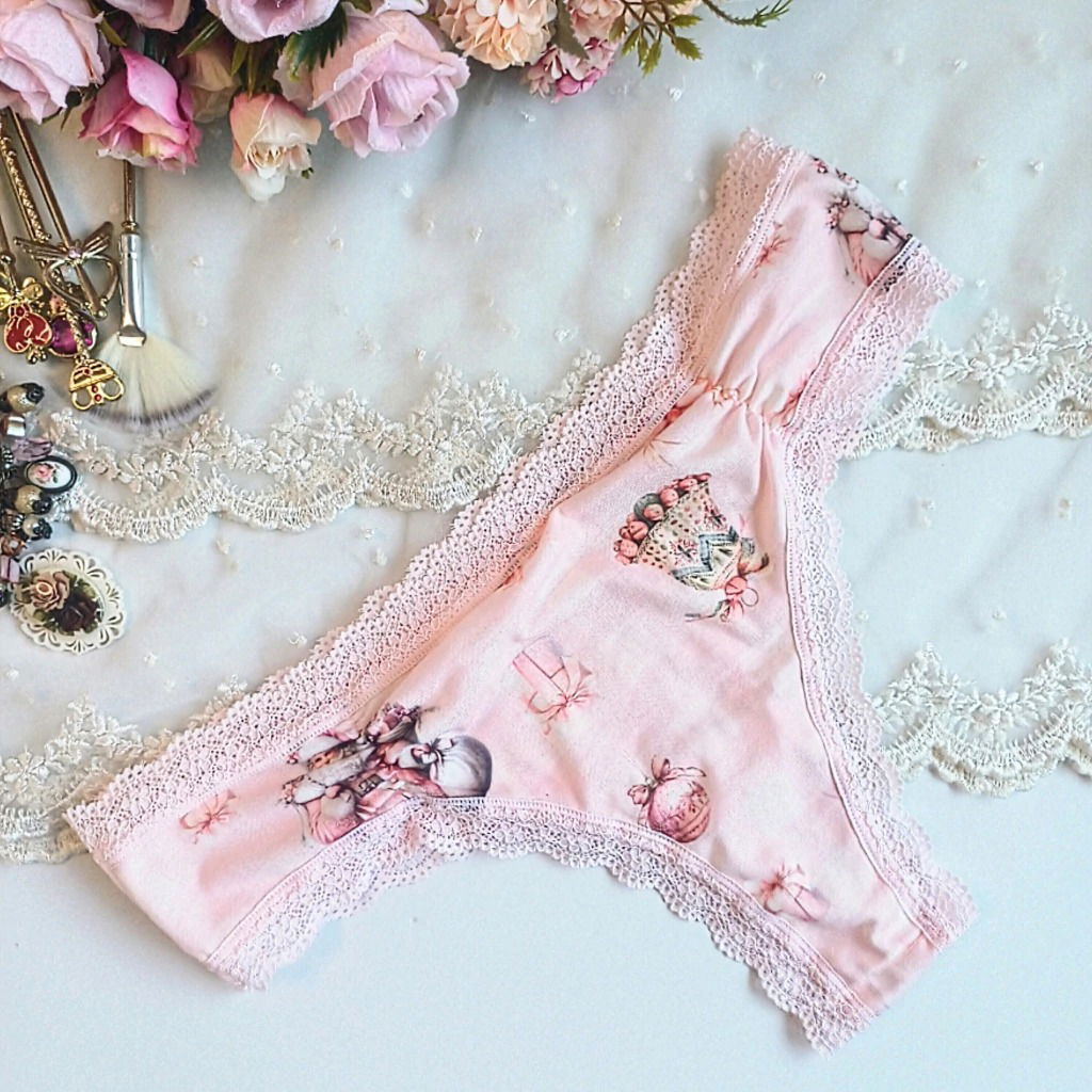 Bombacha cola less confeccionada en modal estampado de Papá Noel, con detalle de puntilla en el contorno de la cintura y las piernas.