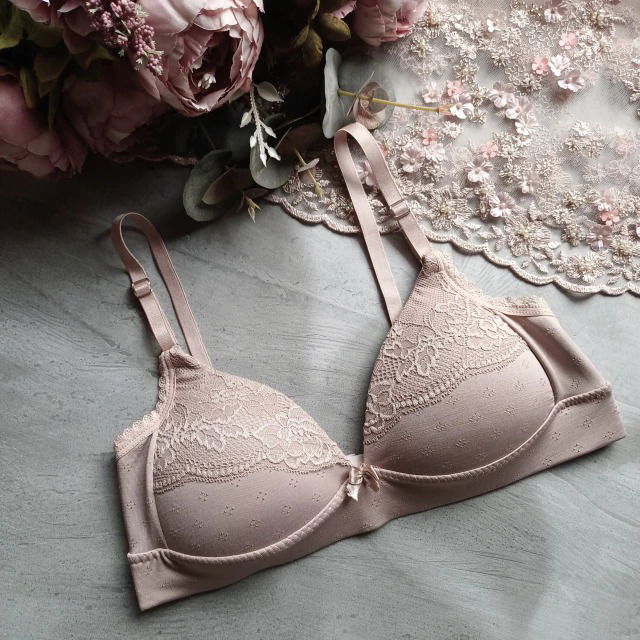 Conjunto de corpiño triángulo taza soft y bombacha cola less confeccionada en microfibra calada color visón con detalles en puntilla.