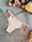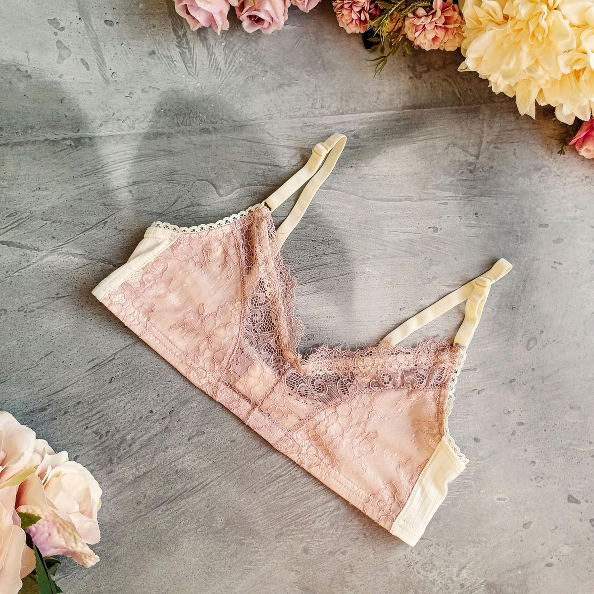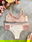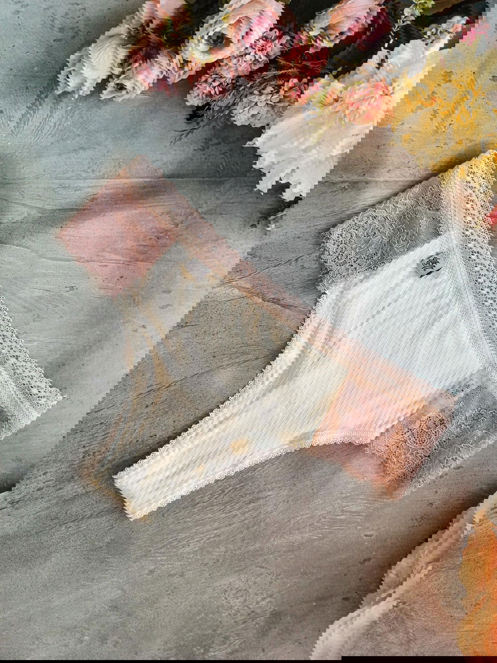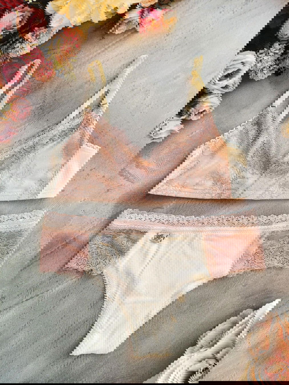 Conjunto de corpiño y culottin cola less confeccionado en morley crudo con detalles en puntilla salmón pastel.