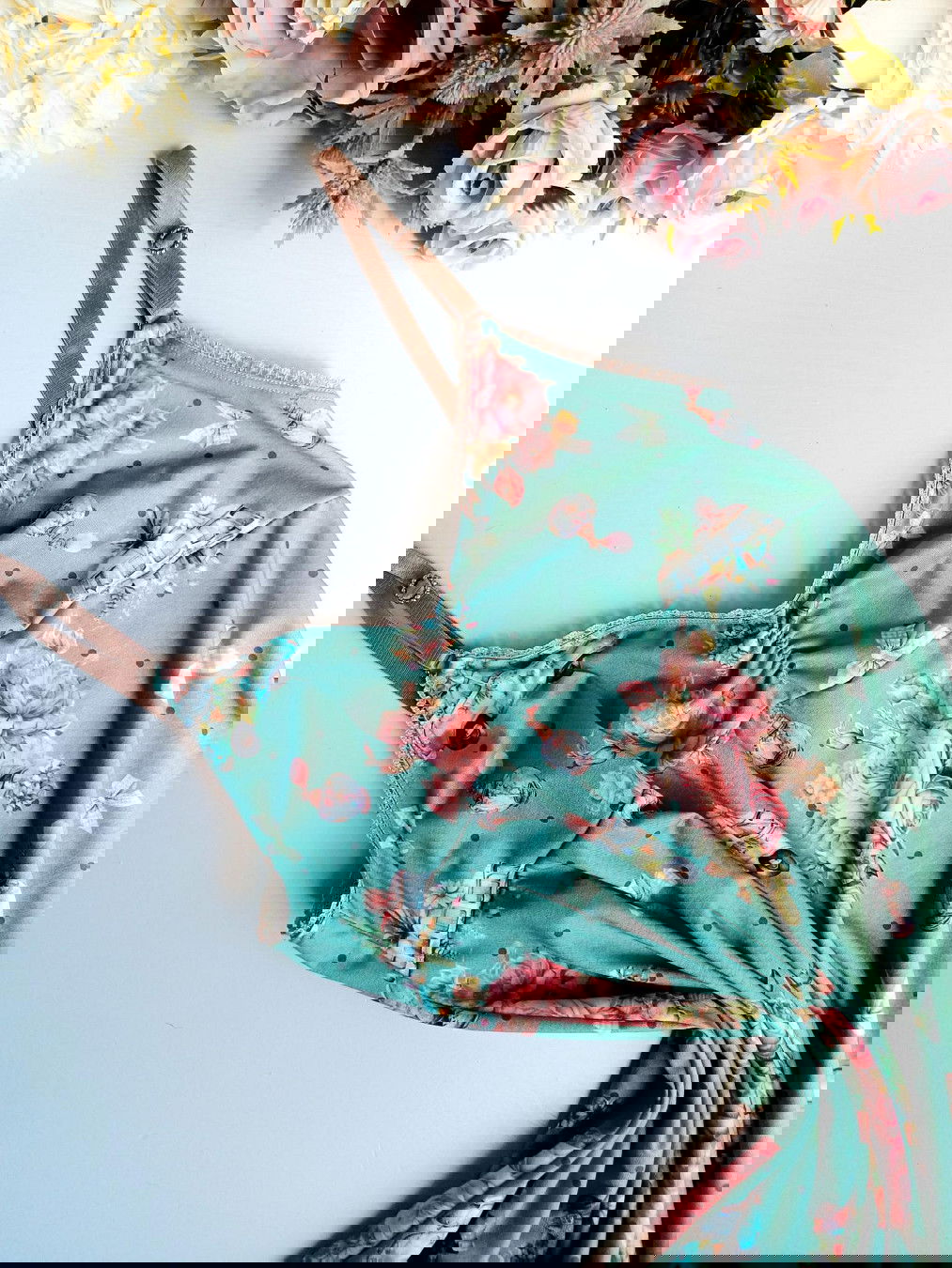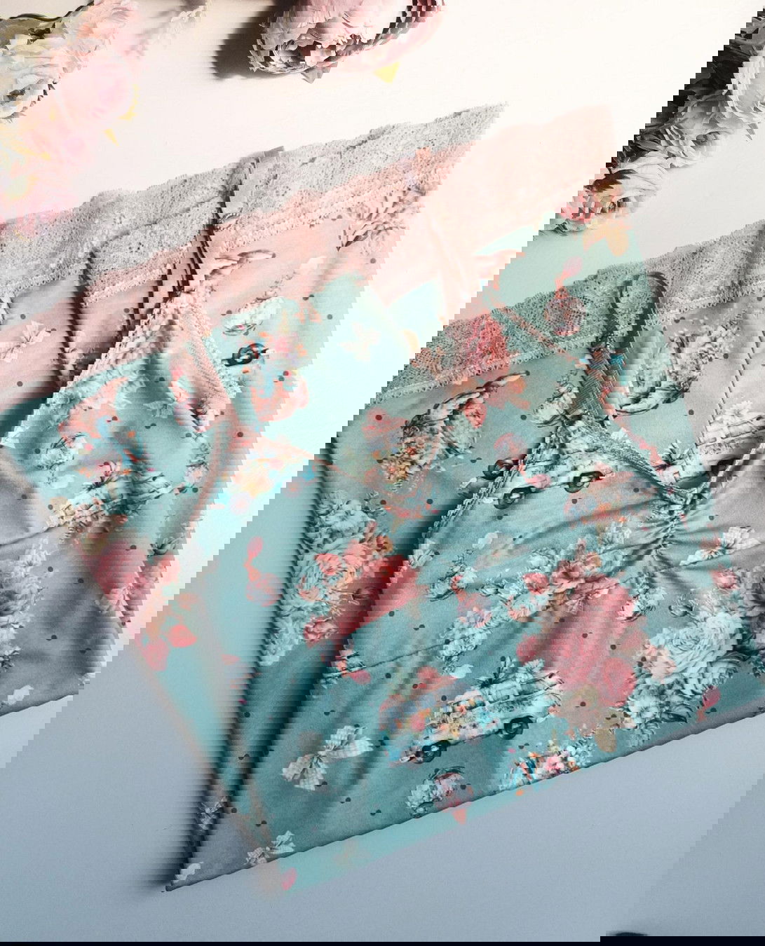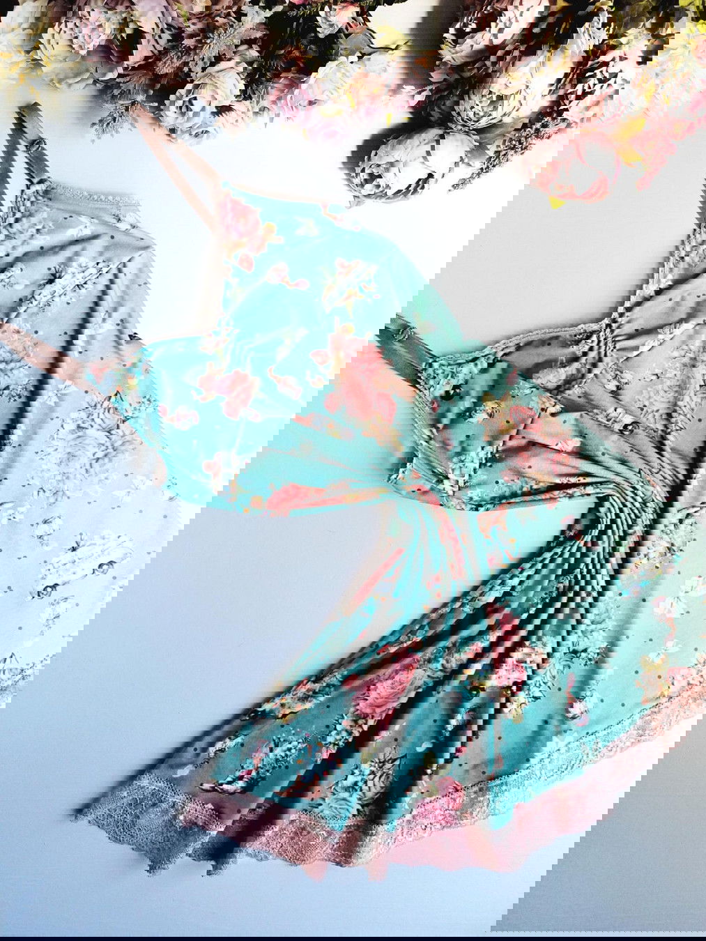 Baby doll confeccionado en algodón fino estampado de botas sobre fondo aqua.