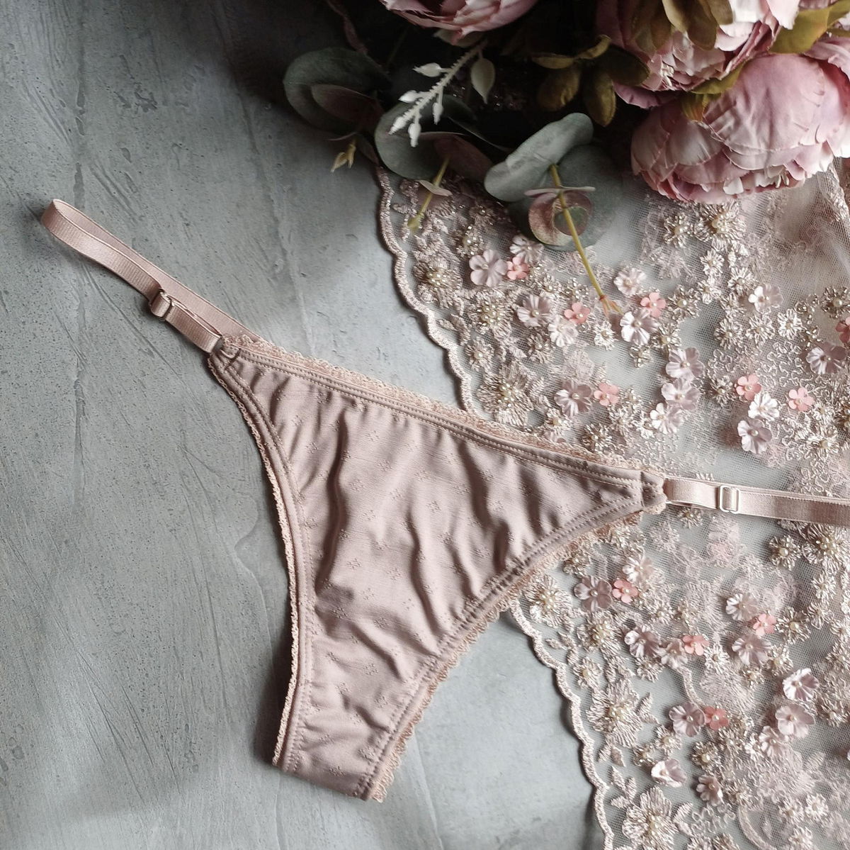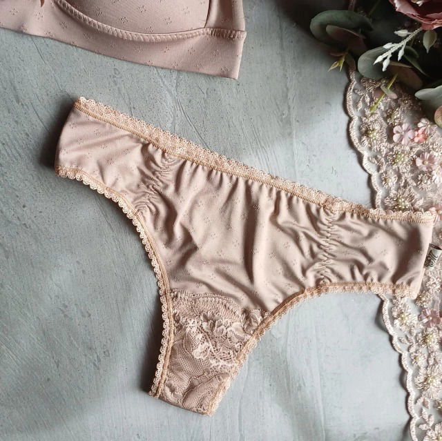 Conjunto taza soft y culottin o tanga cola less en microfibra calada color visón y puntilla a tono *