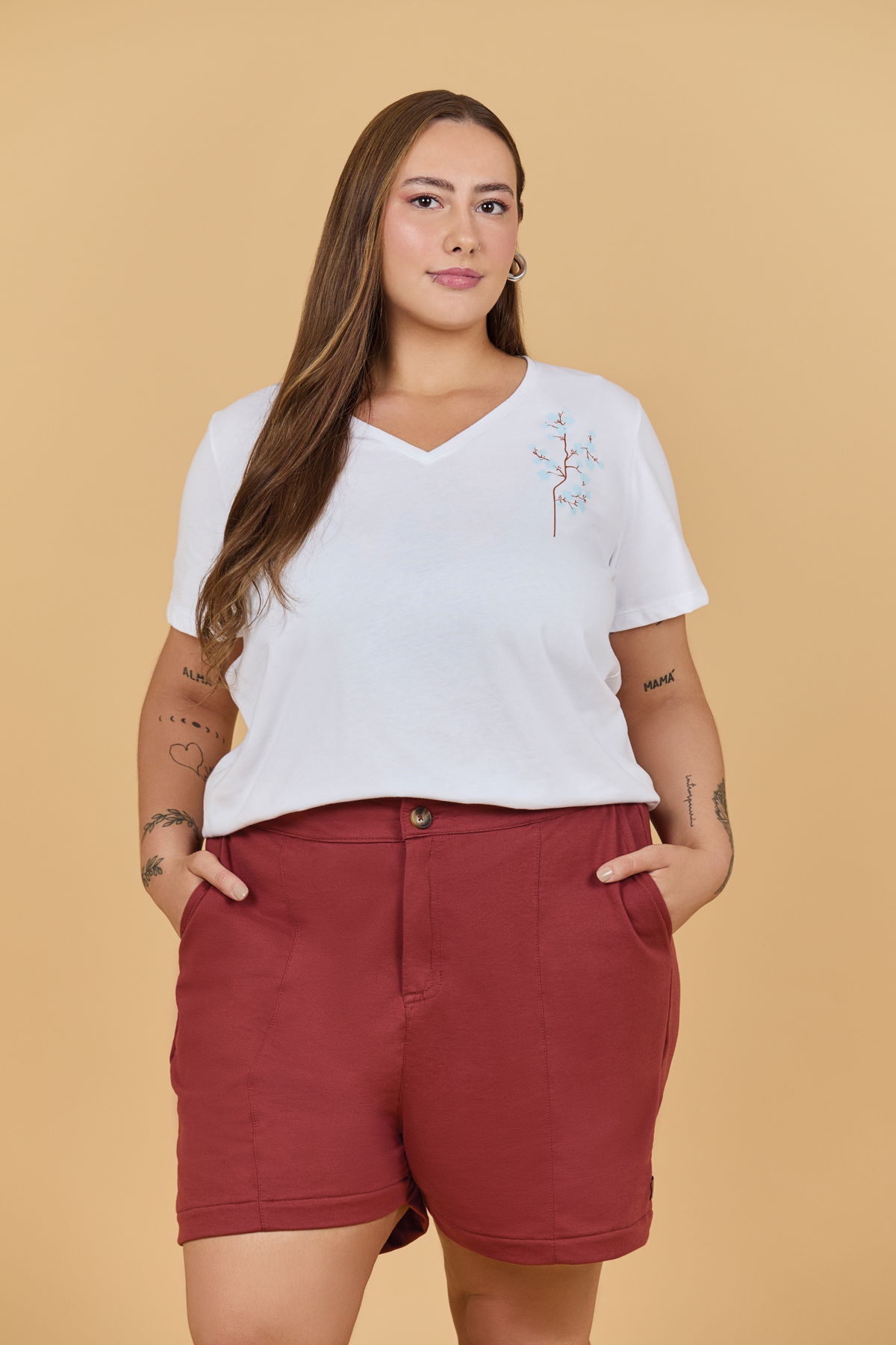 Con bolsillos y recortes verticales. Ajuste con elástico en espalda. Con botón y cierre en cartera. Línea clásica. Algodón rústico liviano. Terracota. TALLE: 4-5-6-7
