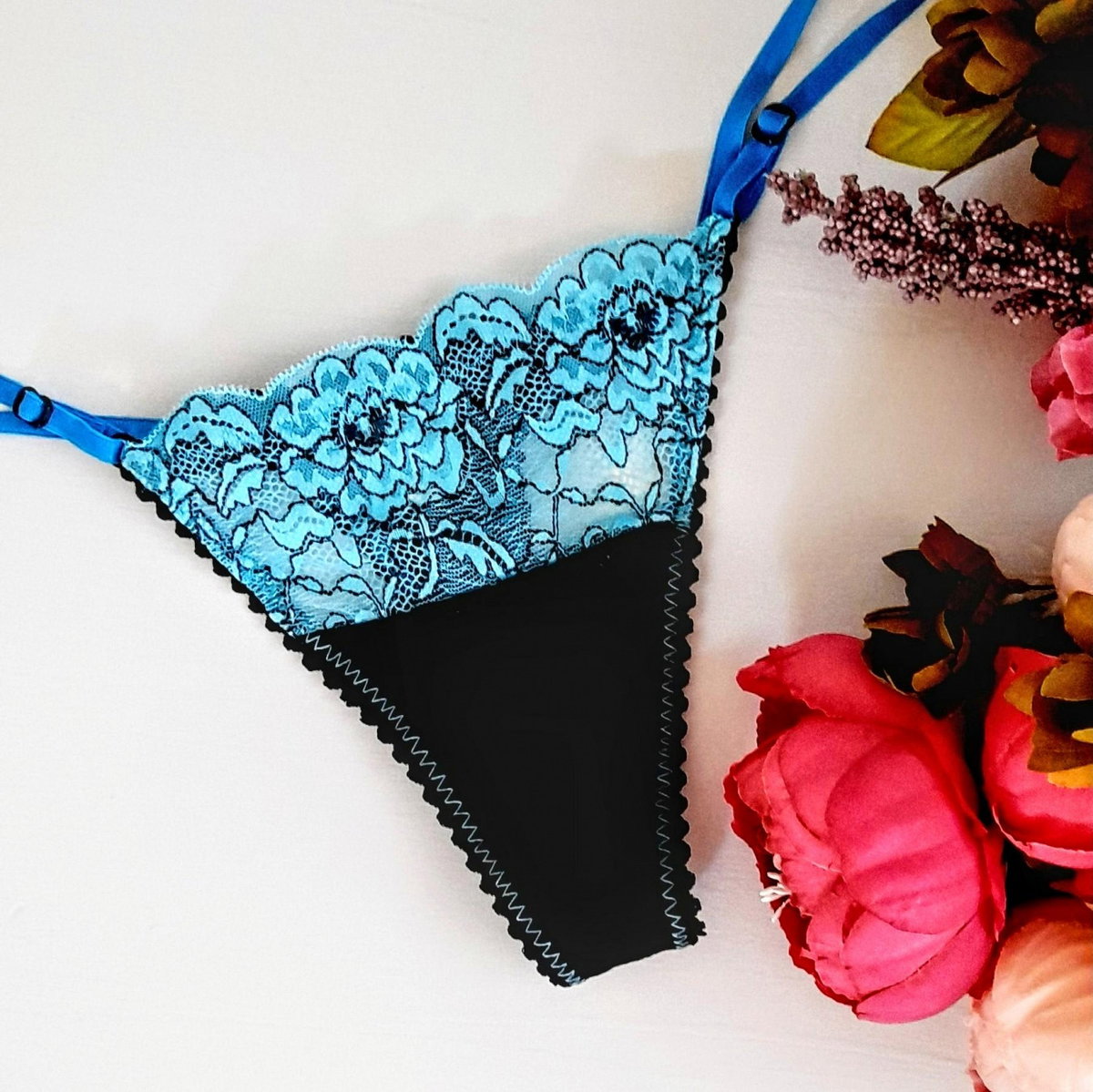 Conjunto de corpiño triangulo con detalle de doble elastico y tanga cola less en puntilla