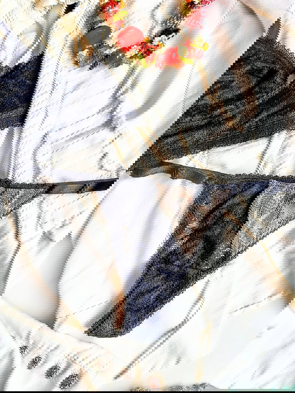 Tanga regulable en encaje negro con detalle en puntilla tostada